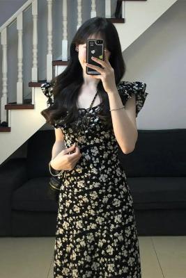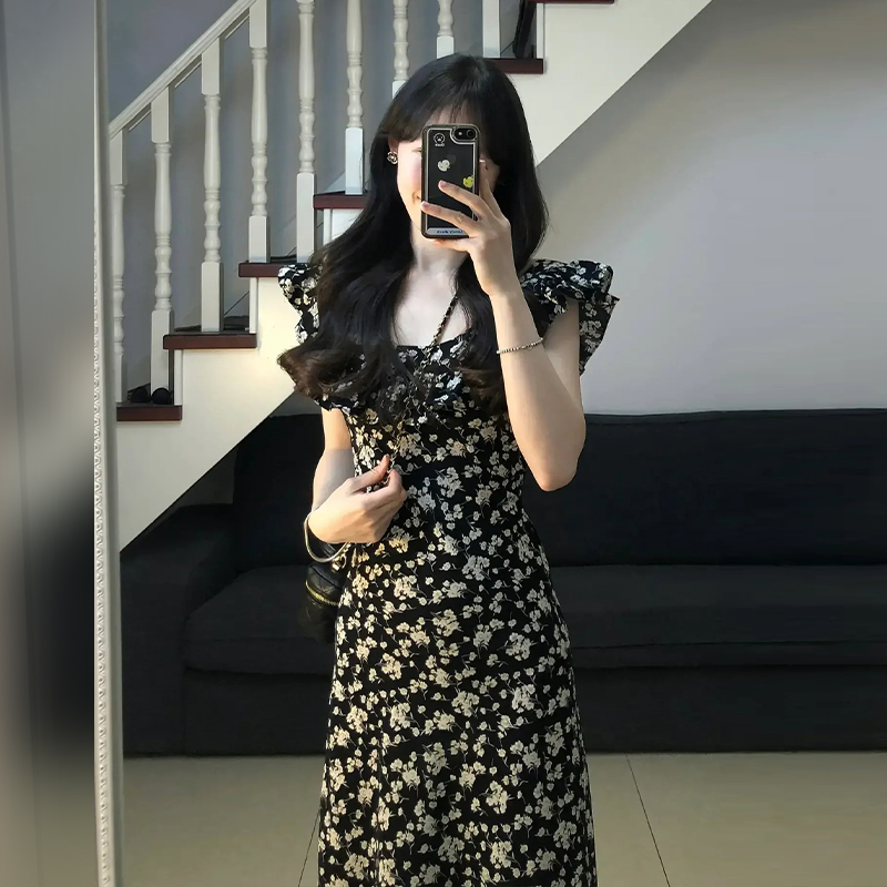 New French niche design high-end waist slimming slit black floral dress for women in summer