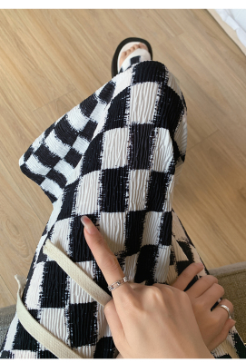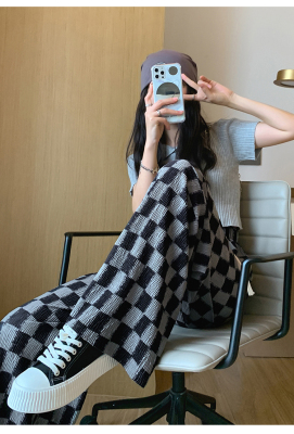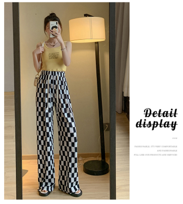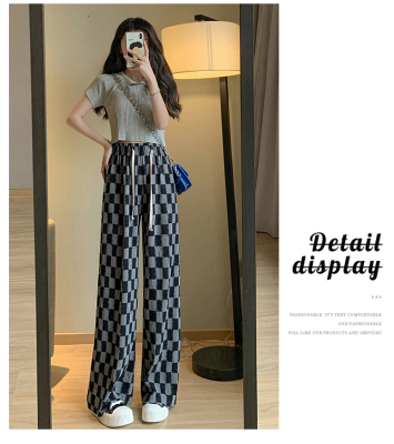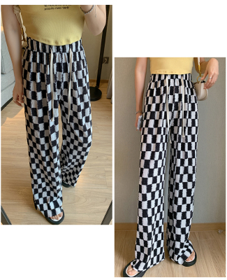 Real shot of ice silk wrinkled checkerboard wide leg pants for women summer thin 2024 high waist drape casual plaid straight pants