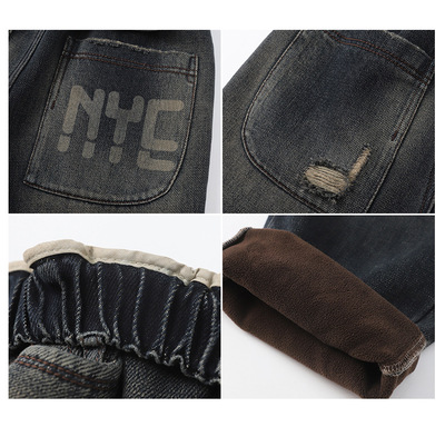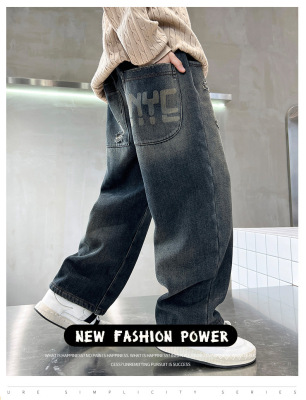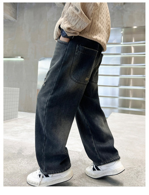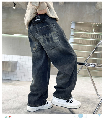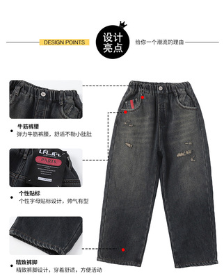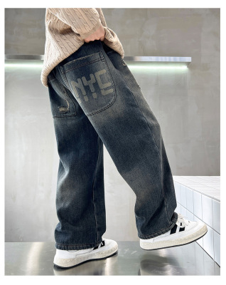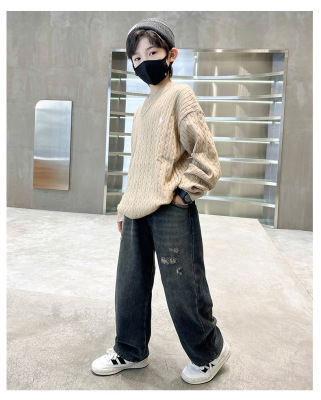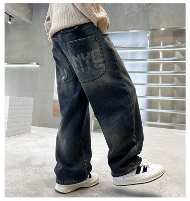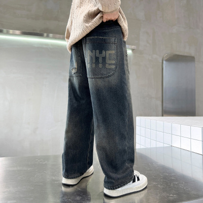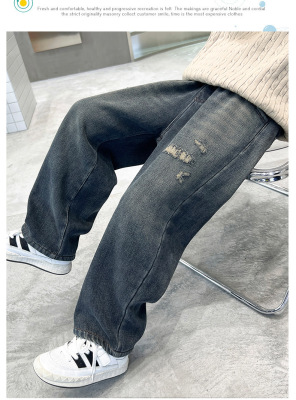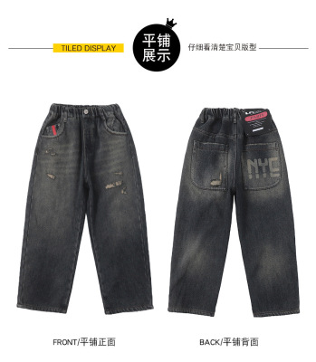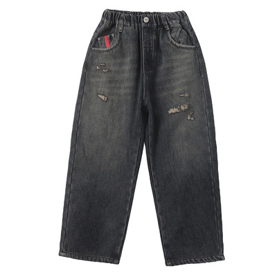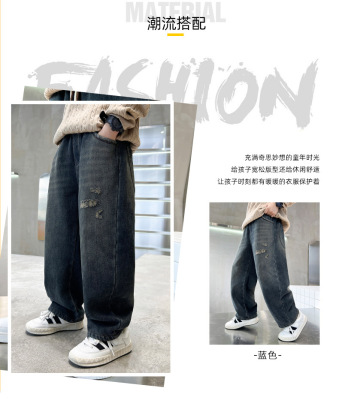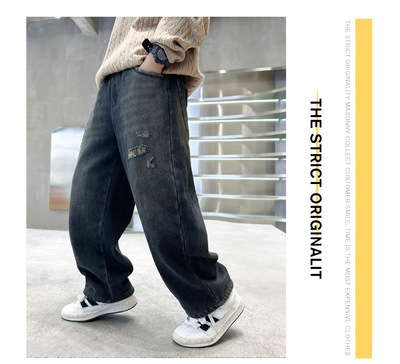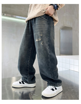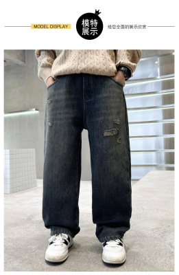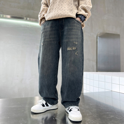 Boy's Straight Leg Jeans Spring 2024 New Middle to Large Kids Casual Fall Wide Leg Pants Children's Hole Pants Trendy