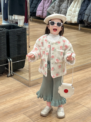 2023冬款韓版女童滿印碎花羊羔絨夾棉加厚保暖防寒百搭夾克外套