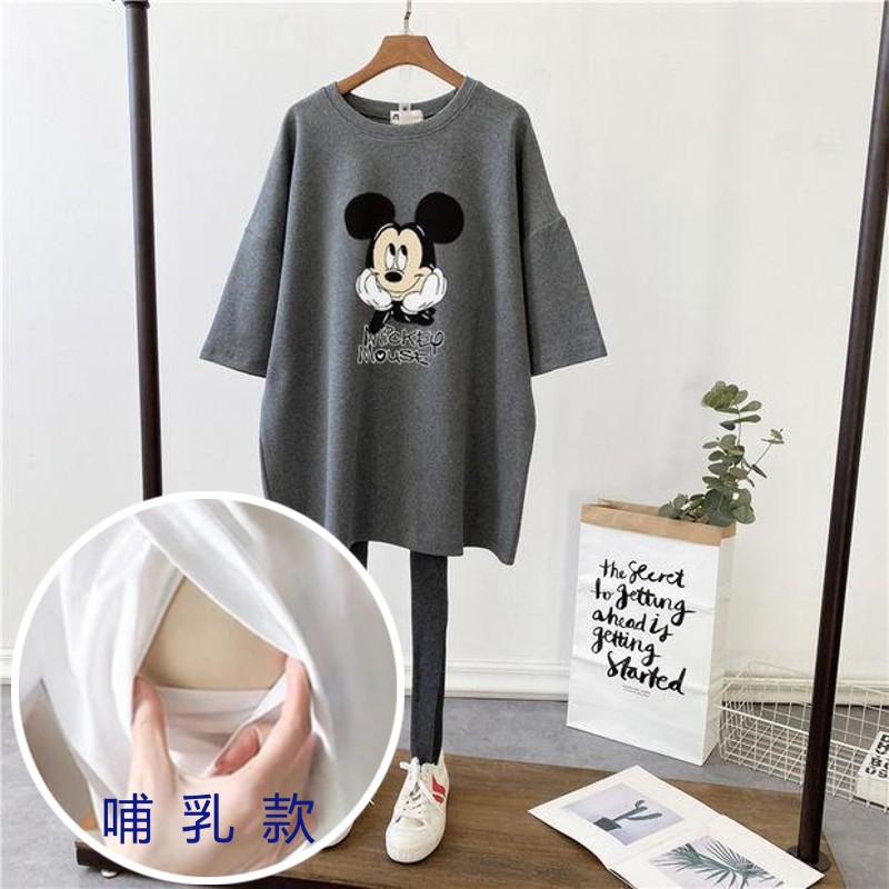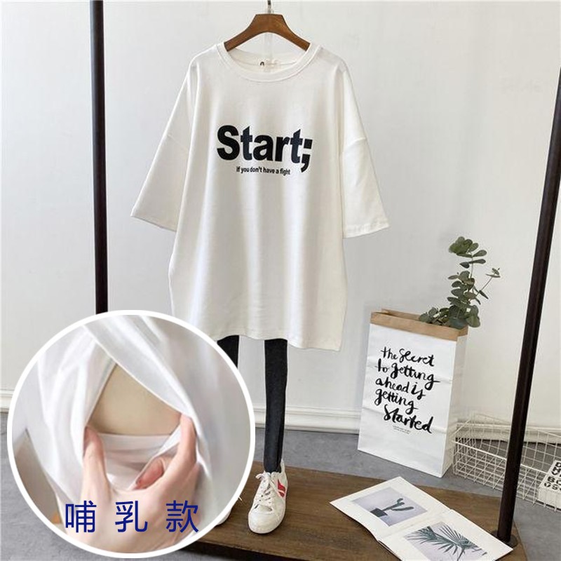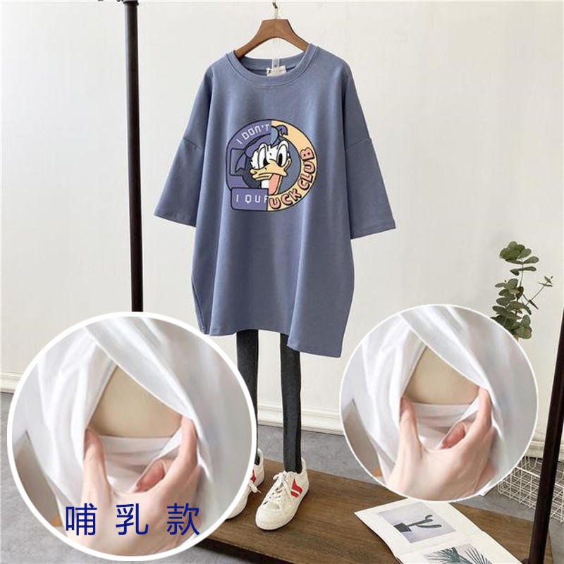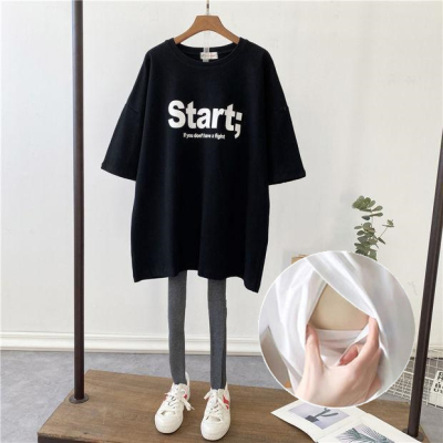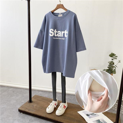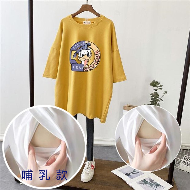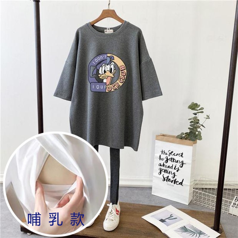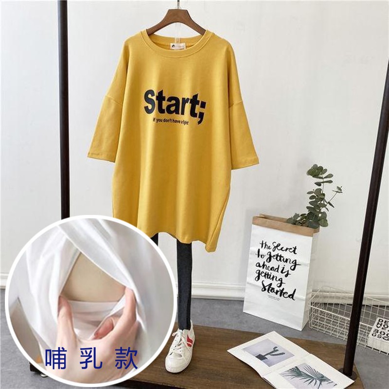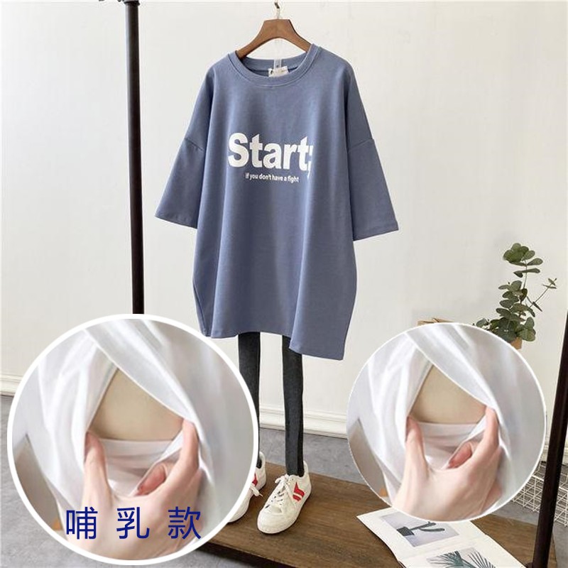 哺乳夏裝新孕婦哺乳短袖中長T恤寬鬆月子服餵奶上衣裙外出辣媽款