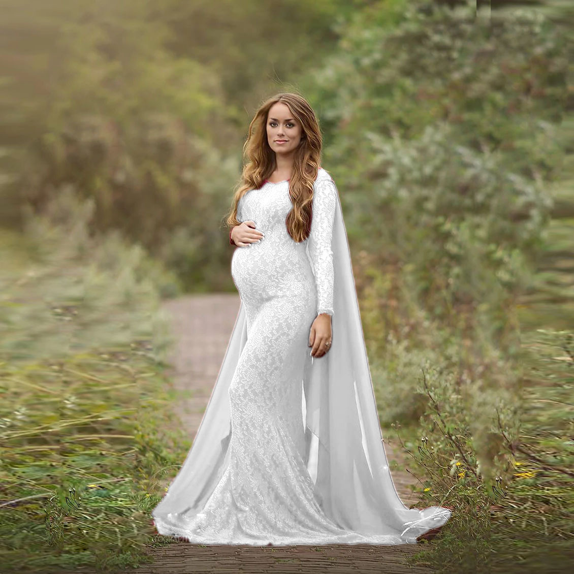 亞巴遜速賣通孕婦長袖寫真攝影拖地後加飄逸雪紡長裙連衣裙1123