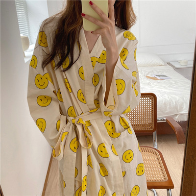 2021秋季新款可愛笑臉睡袍純棉長袖系帶浴袍和服女ins家居服睡衣