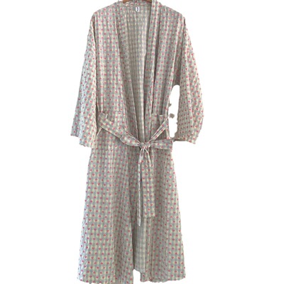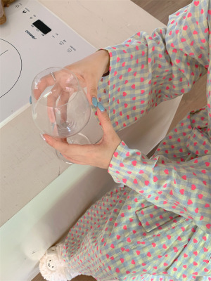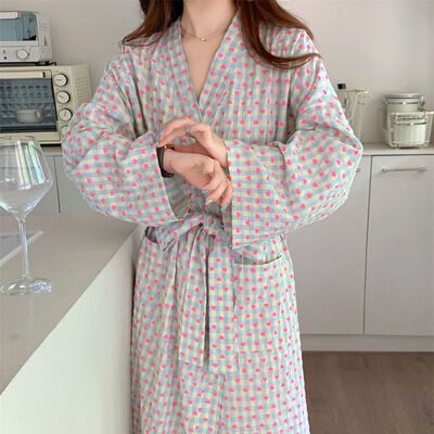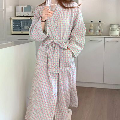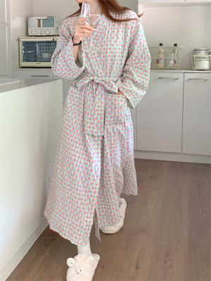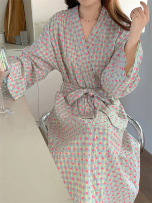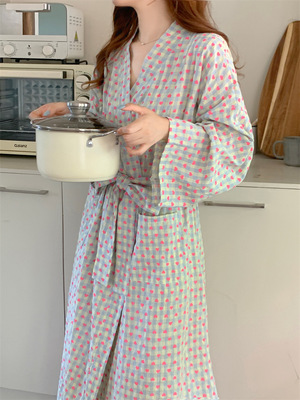 韓版秋季新款甜美格子愛心印花睡袍女寬鬆長款和服浴袍可愛家居服