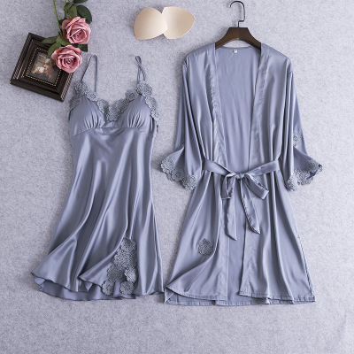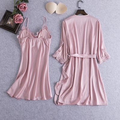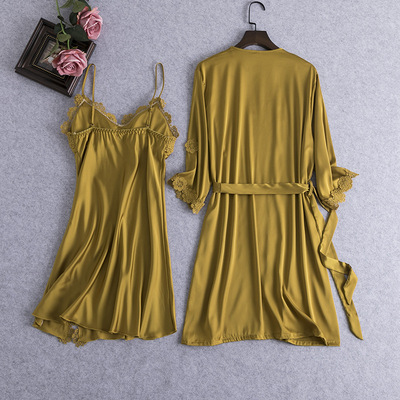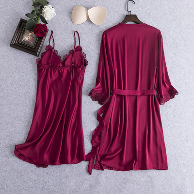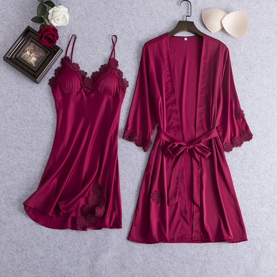 New Women's Sleepwear Lace Edge Robe Sweet Strap Nightgown Two-Piece Ice Silk Bandage Bralette Homecoming Suit