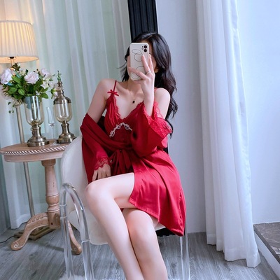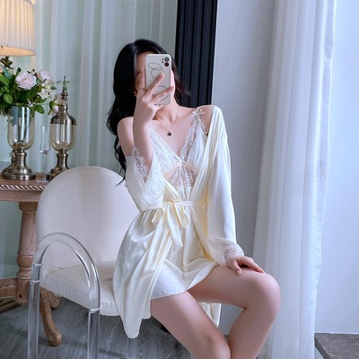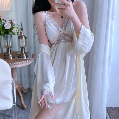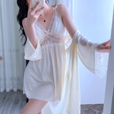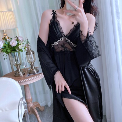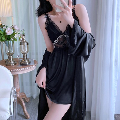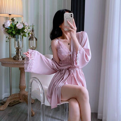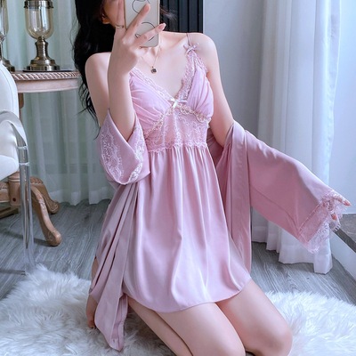 新款性感睡衣女夏季薄款花邊吊帶睡裙睡袍兩件套帶胸墊廠家直銷