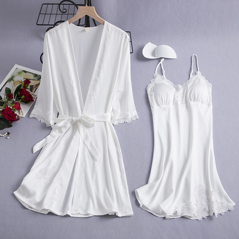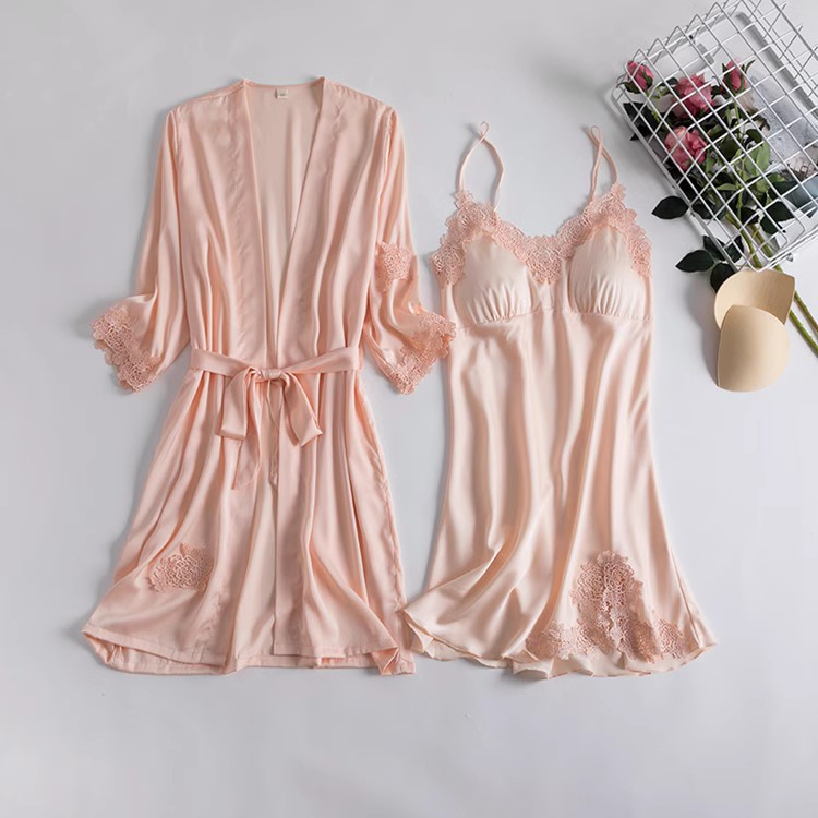 Summer silk nightgown for women, sexy slip-style pajamas, two-piece set, faux-silk loungewear with lace trim—dropshipping available.