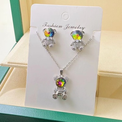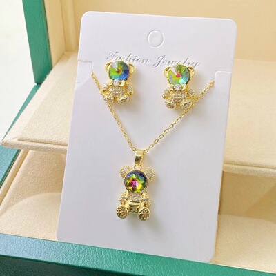 歐美跨境新款小熊鈦鋼項鍊耳環微鑲鋯石滿鑽吊墜輕奢重工氣質套裝