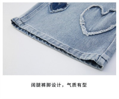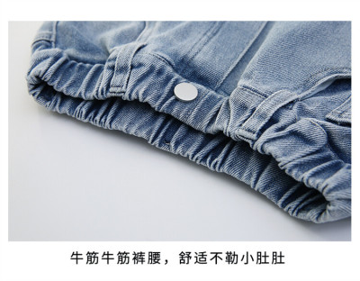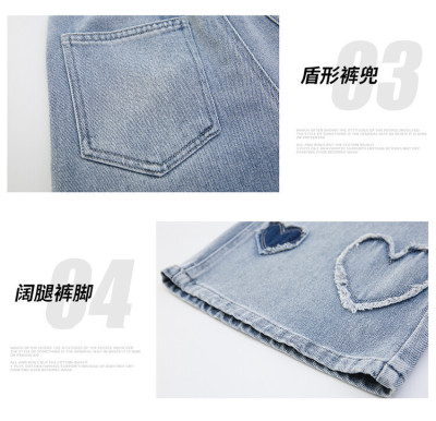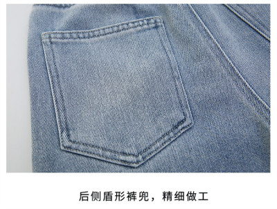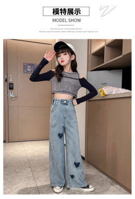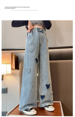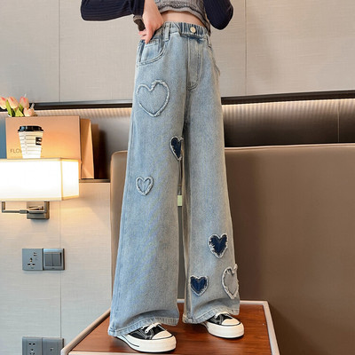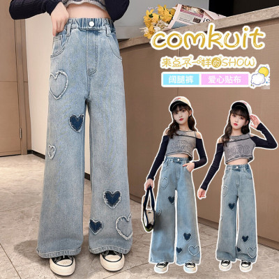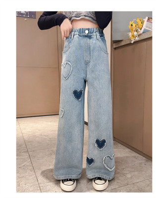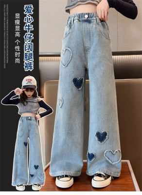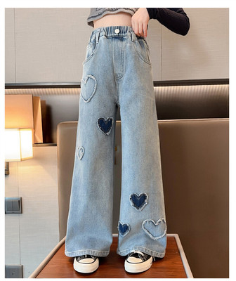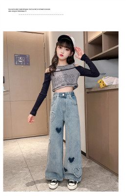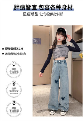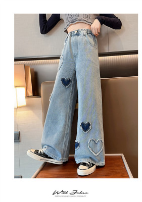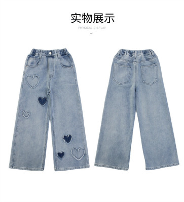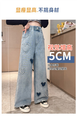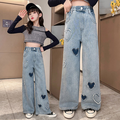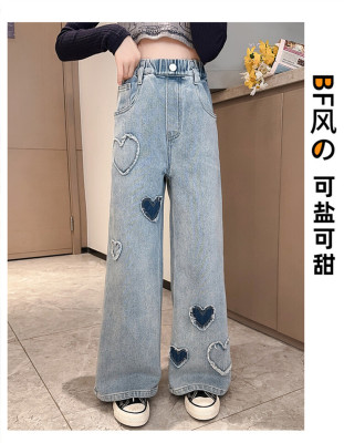 Spring and Autumn New Women and Children's Denim Wide Leg Pants Straight Leg Pants Middle and Large Children Loose Elastic Long Pants Children's Denim Children's Clothing