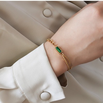 Green Zircon Double Chain Necklace Bracelet Earrings Set Double Chain Layering Retro Small Square Set Decoration Women