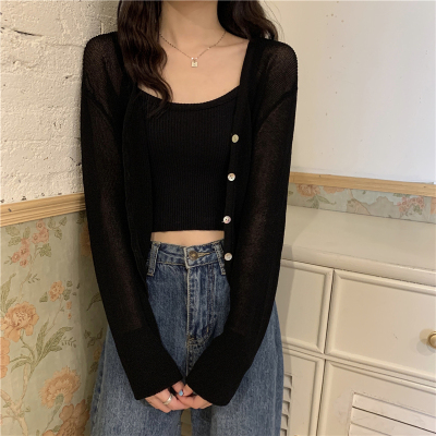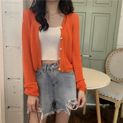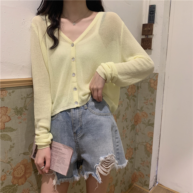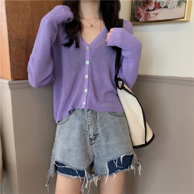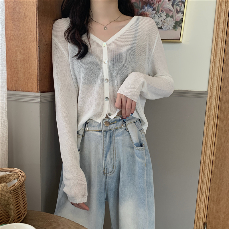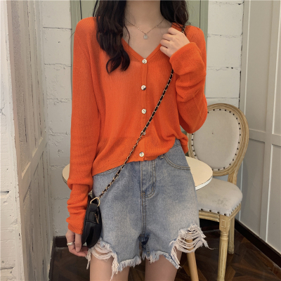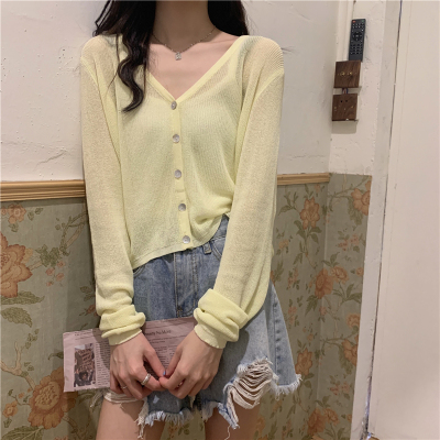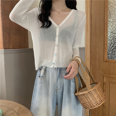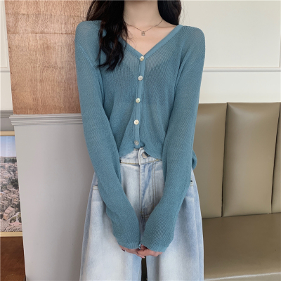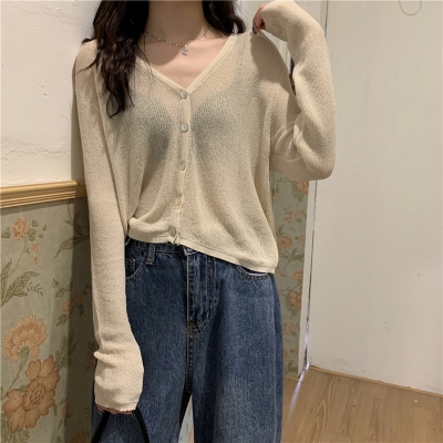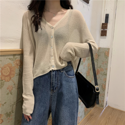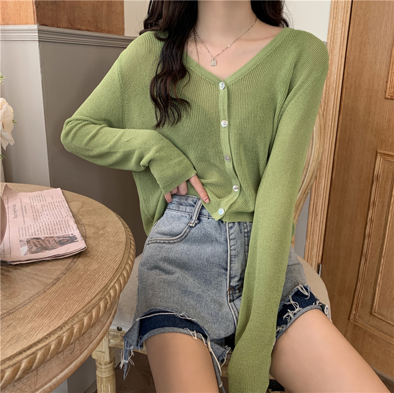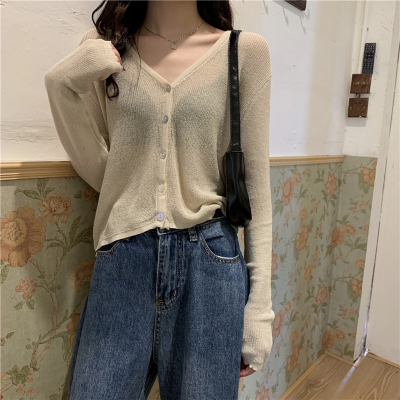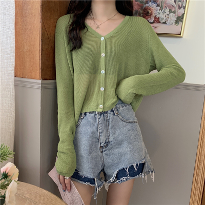 Real shot, new summer Korean style loose thin solid color v-neck knitted long-sleeved sun protection cardigan