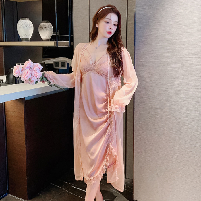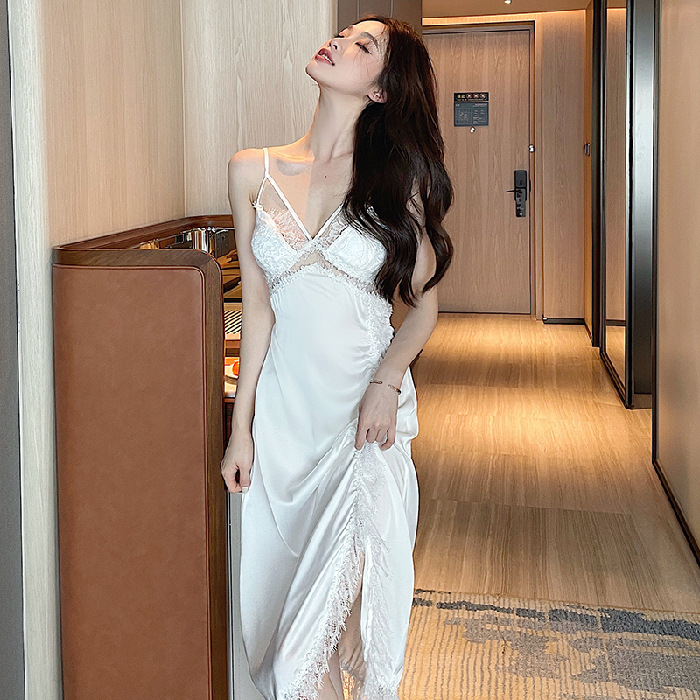 Ladies' Spring Sleep Dress with Bralette, Long Sleeve, Lace Edge, V-Neck, Chilled Silk, Fitted Slimming, Extra Long Sleep Dress for Women, Thin