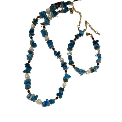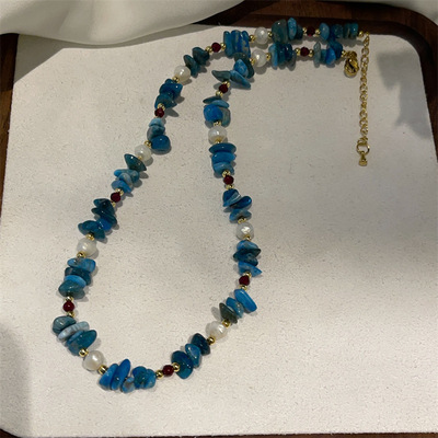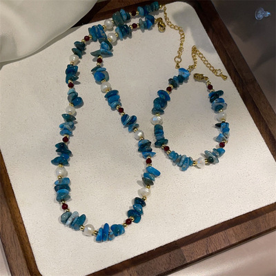 高級感天然石藍色不規則碎石淡水真珍珠項鍊夏季手鍊女首飾套裝