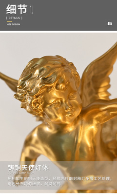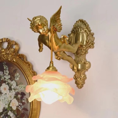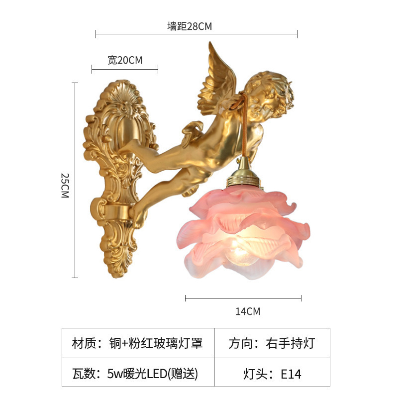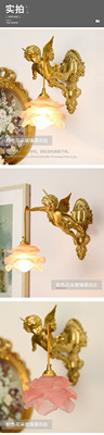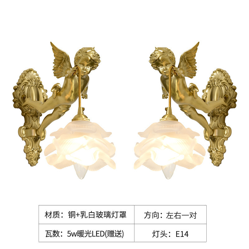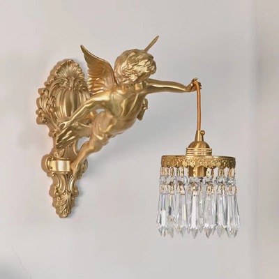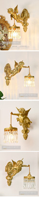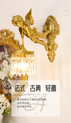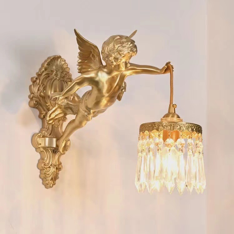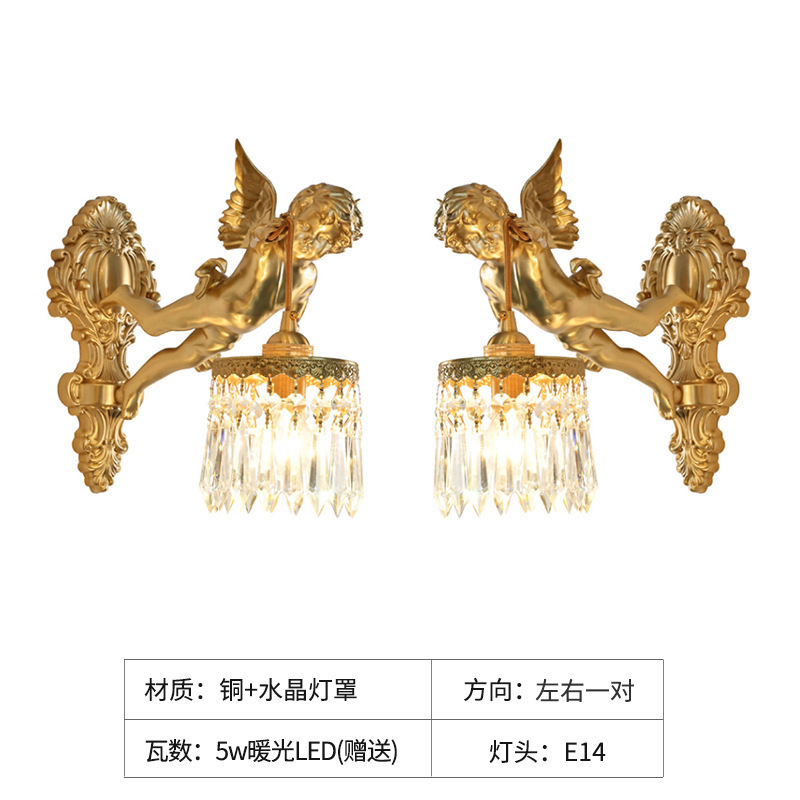 French full copper angel wall lamp for antique living room, bedroom, study, hallway, wall light, American retro luxury crystal lighting