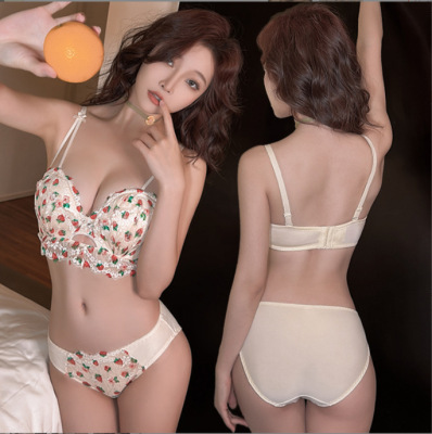 Sweet girly strawberry underwear with small balls and small breasts that are pushed up to look bigger without wires, sexy lace adjustment bra
