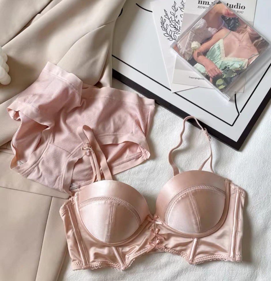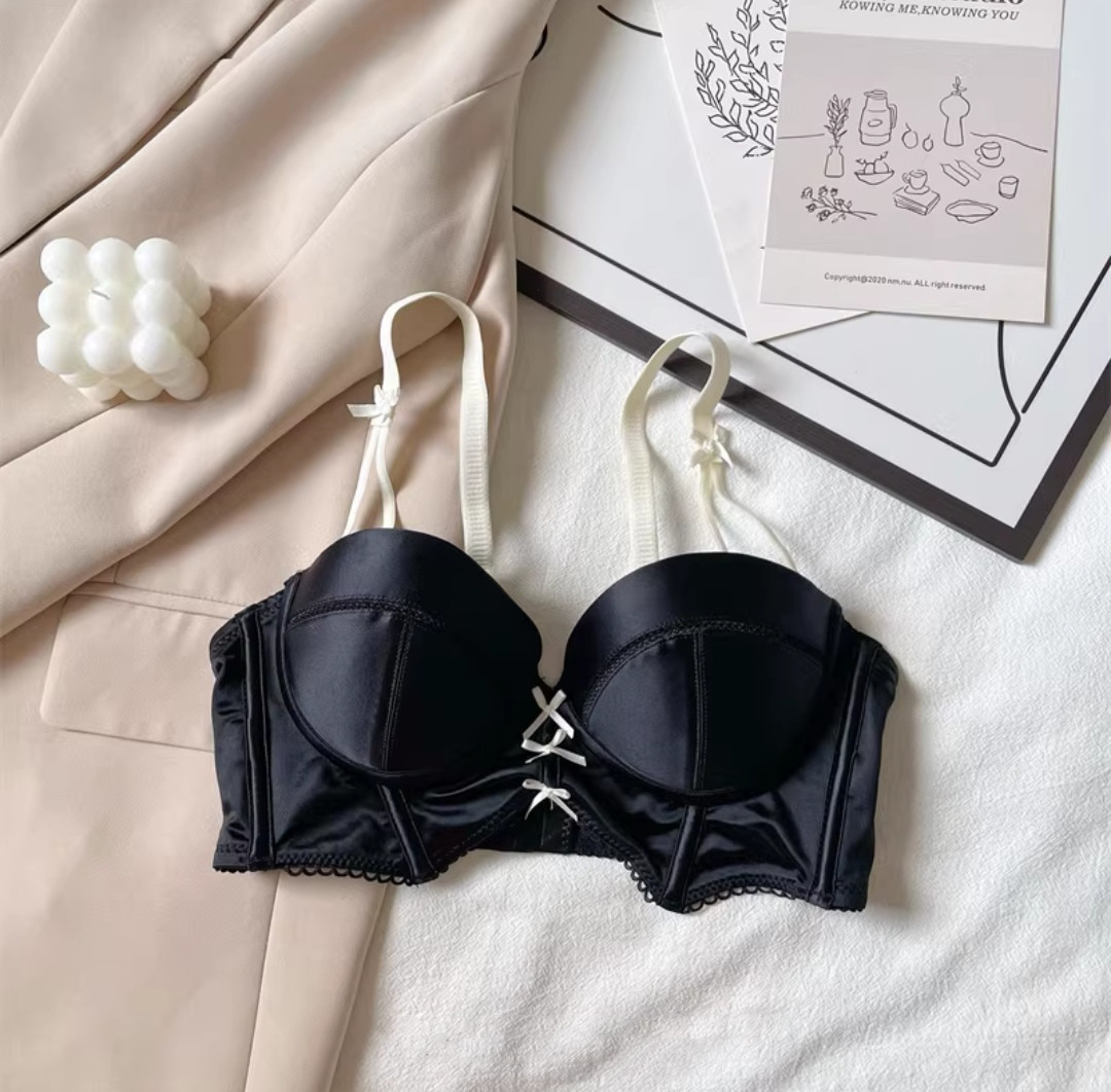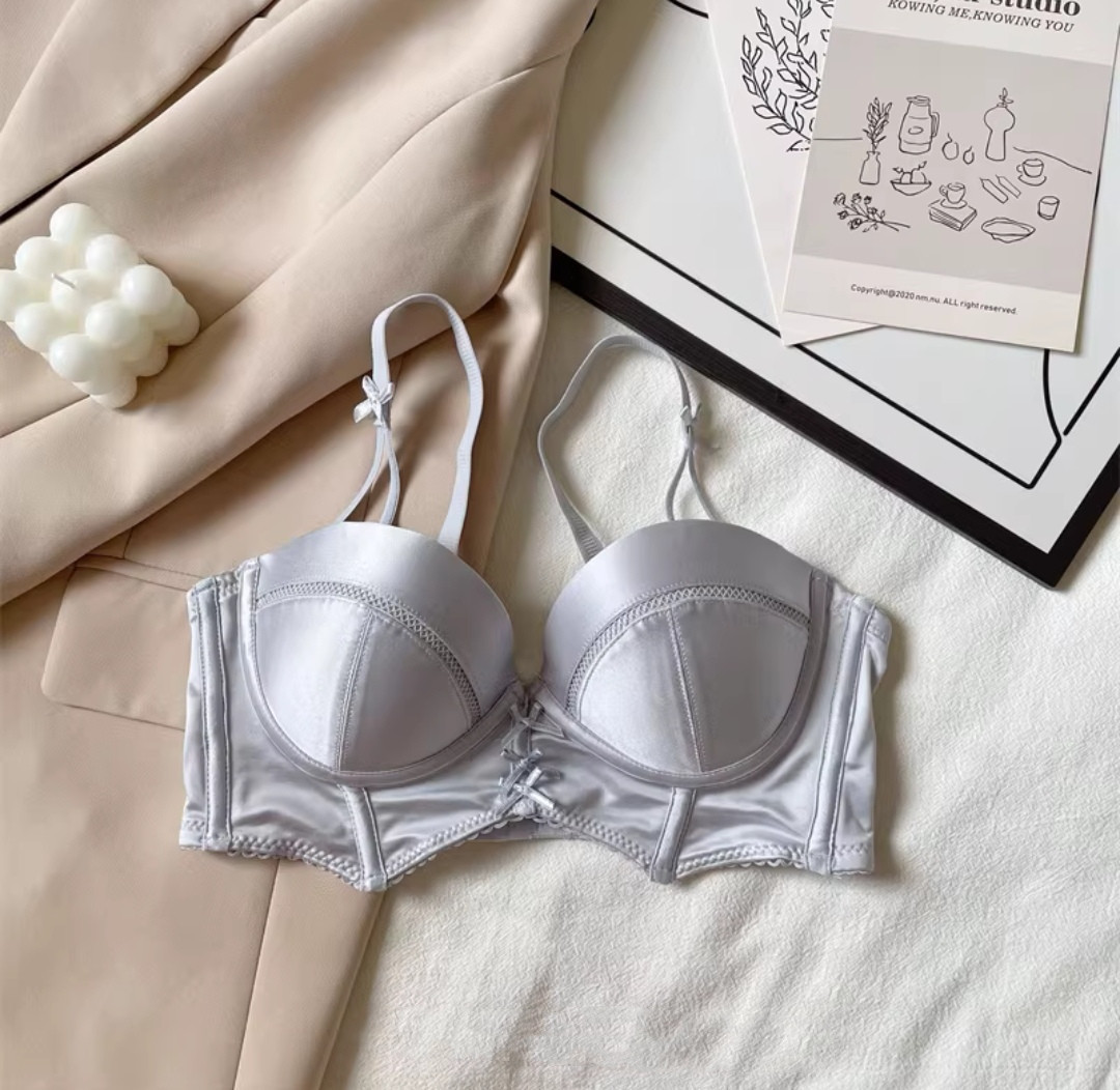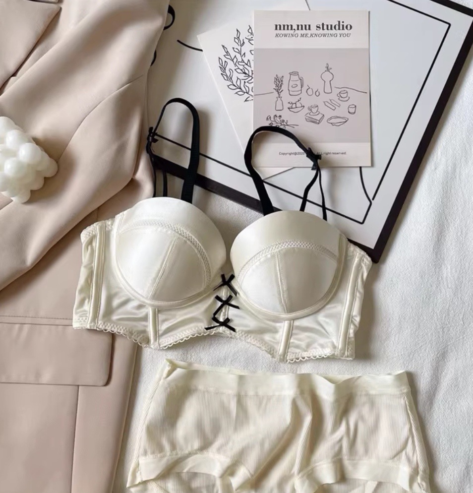 French retro girly bra with detachable shoulder straps, satin underwear, small breast push-up, wire-free French bra set
