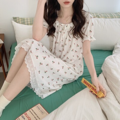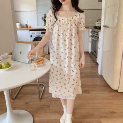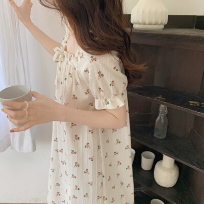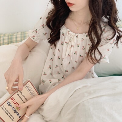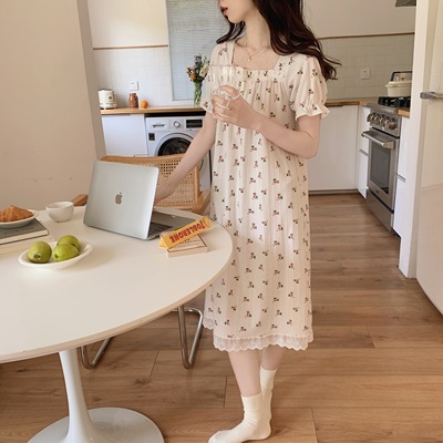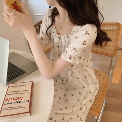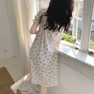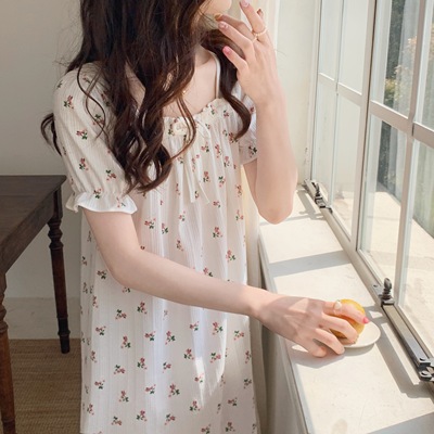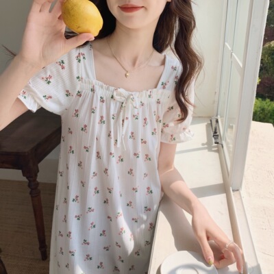 Real shot of French romantic and sweet girl's small floral pure desire square neck printed nightgown short-sleeved pajamas Xia Xin