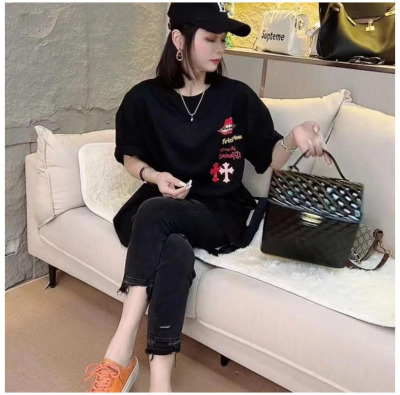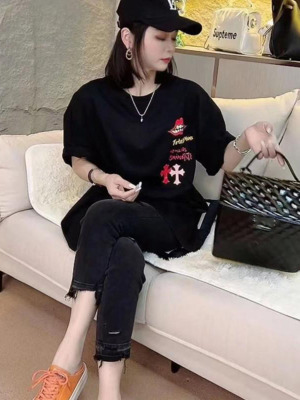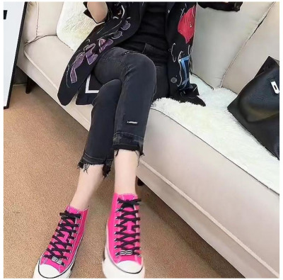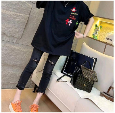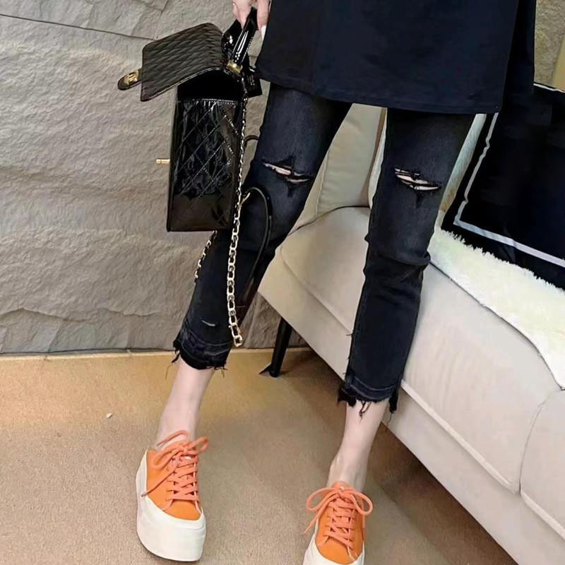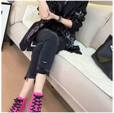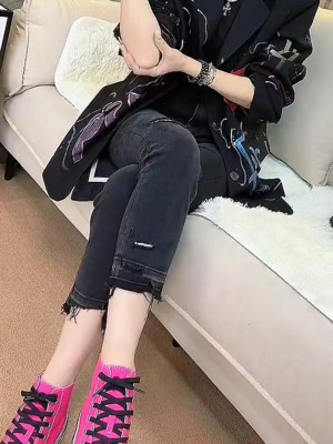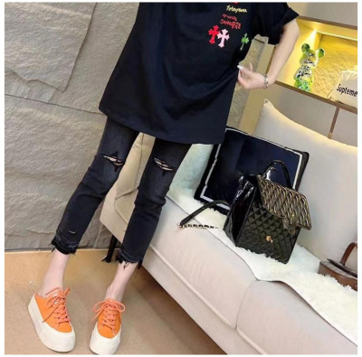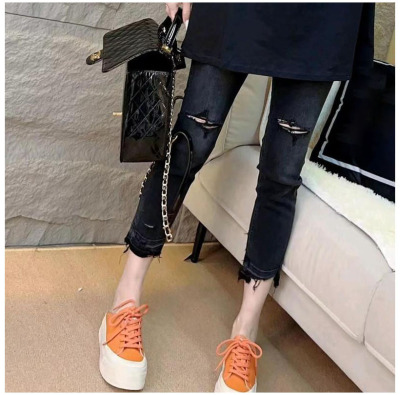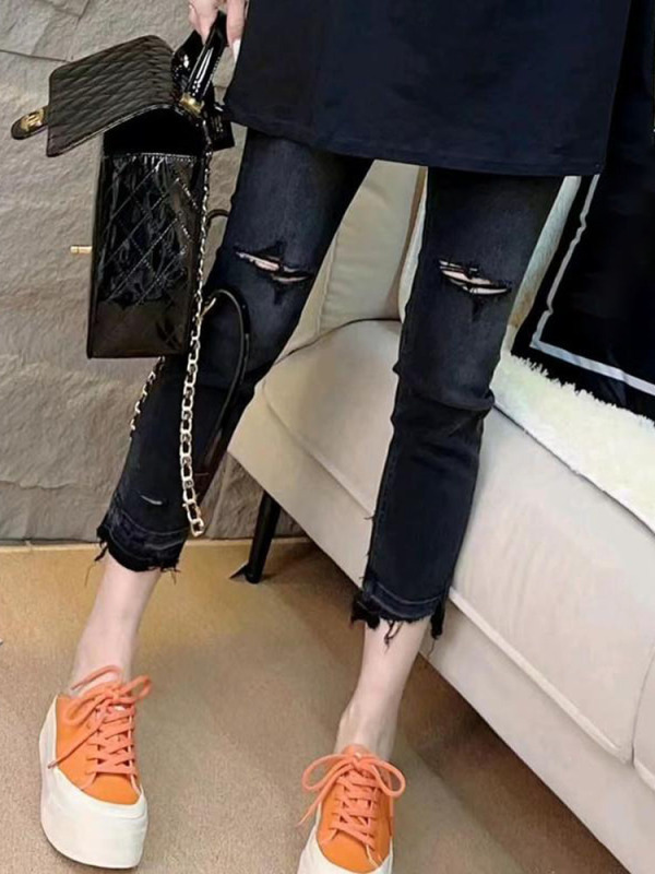 Spring and summer new style raw edge ripped cropped jeans women's large size straight all-match slim stretch cigarette pants
