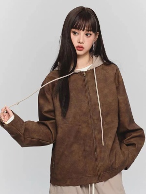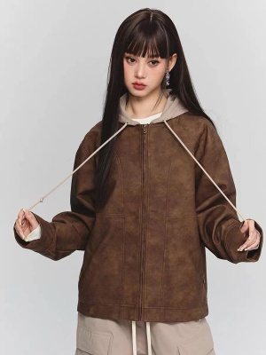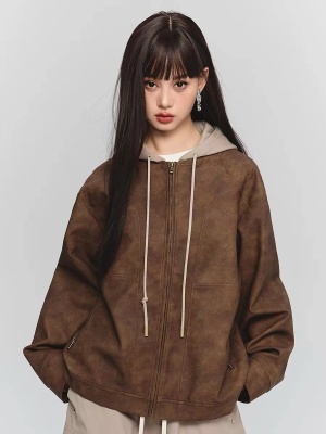 Autumn sweatshirt American top fake two-piece tie-dye leather jacket hooded cardigan coat for women