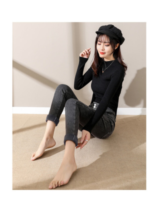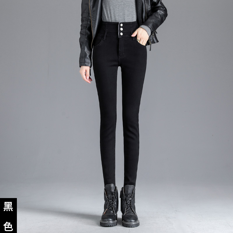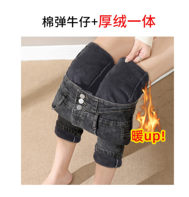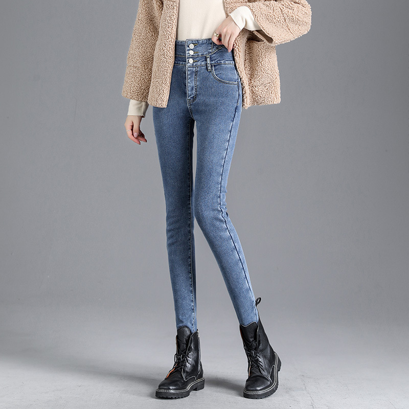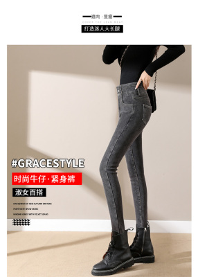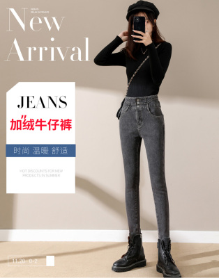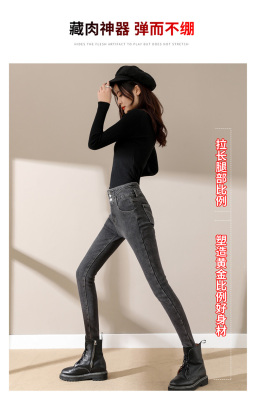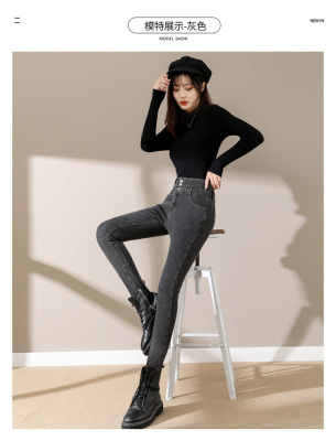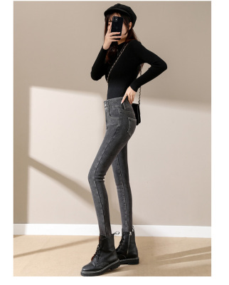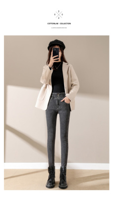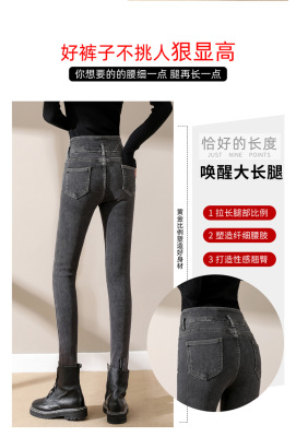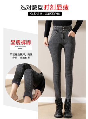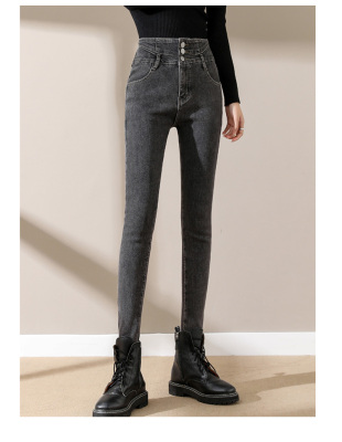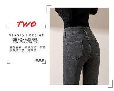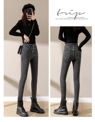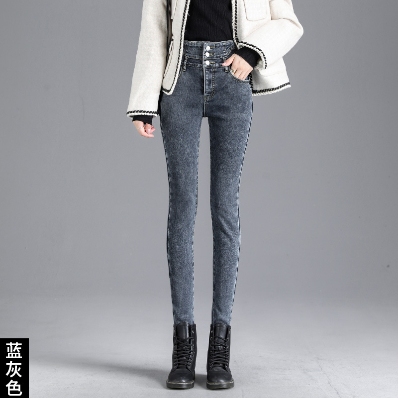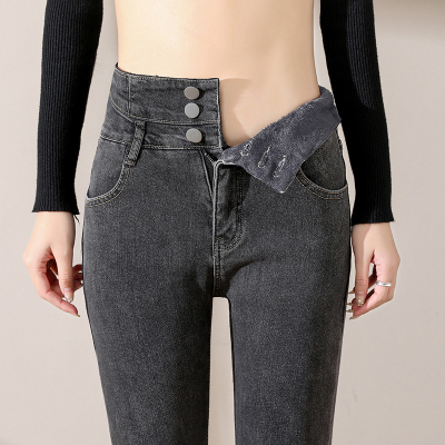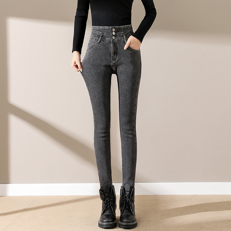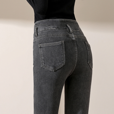 Smoke gray velvet thickened jeans for women, small-legged pants for winter wear, high-waisted slimming pencil pants for women