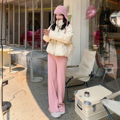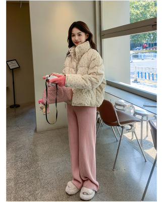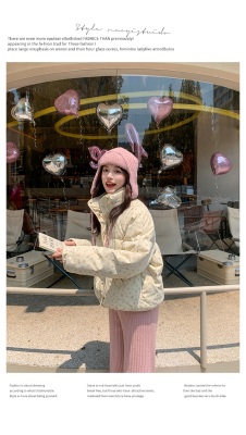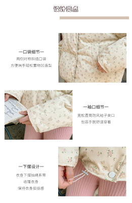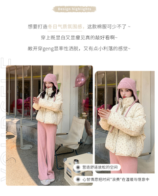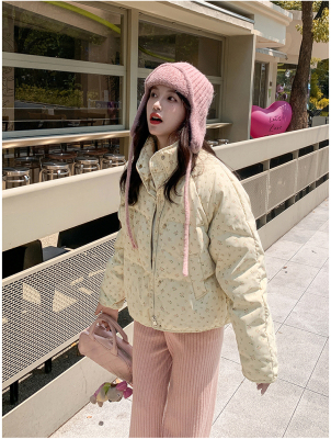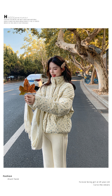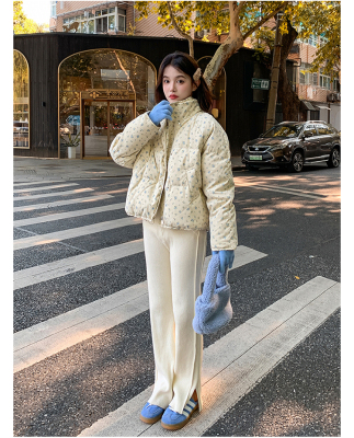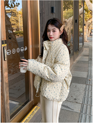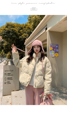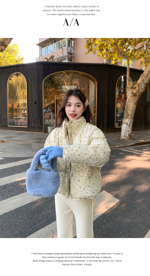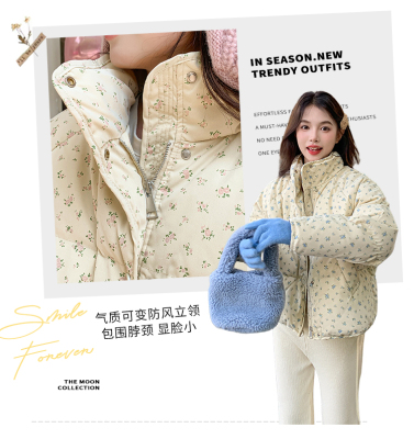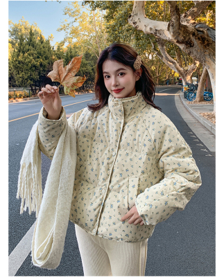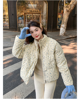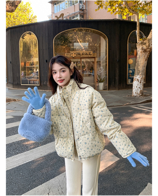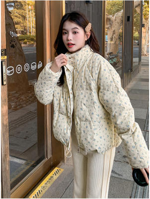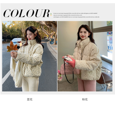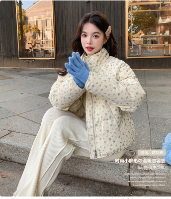 This item is a real-shot, winter-ready, Korean-style short puffer cotton coat featuring delicate floral patterns—perfect for students looking for a stylish, thickened, stand-collar design.