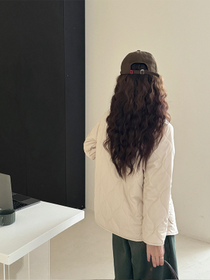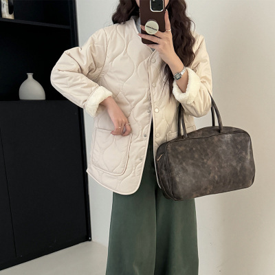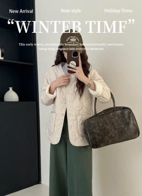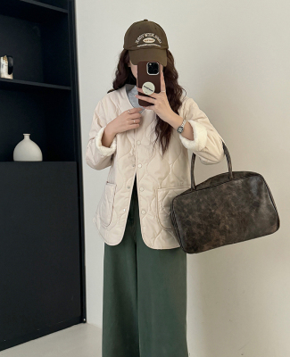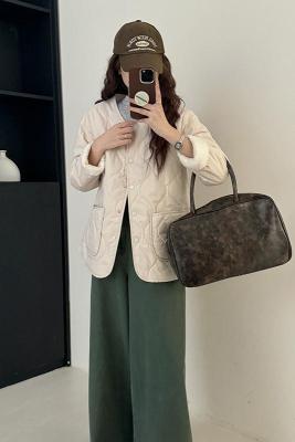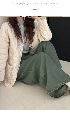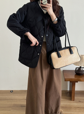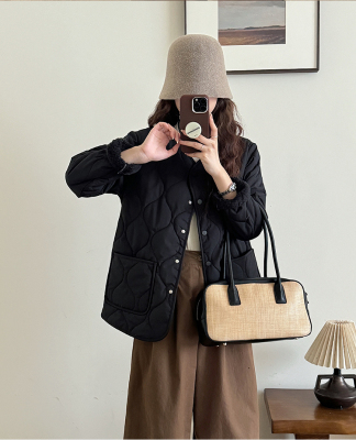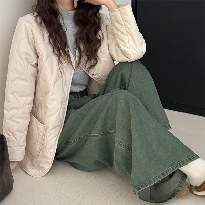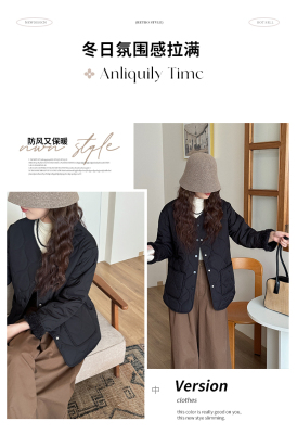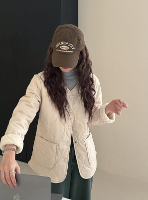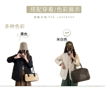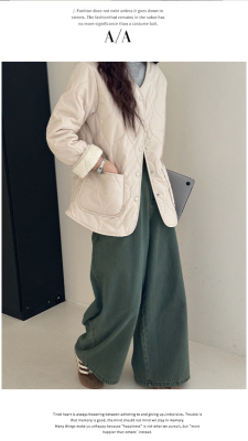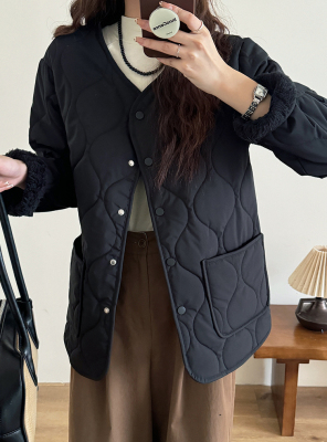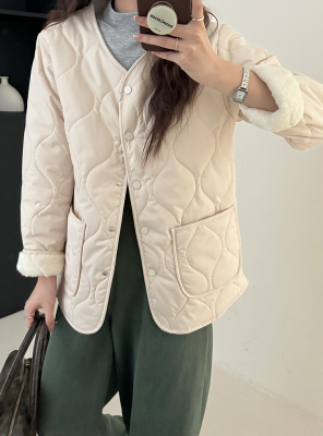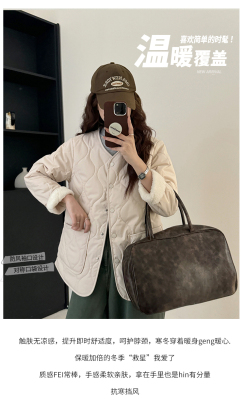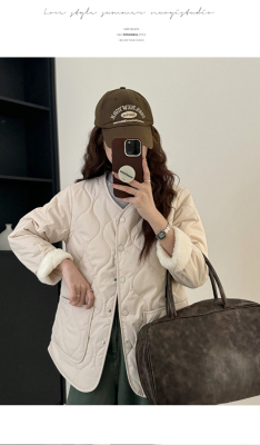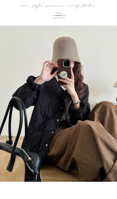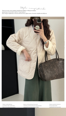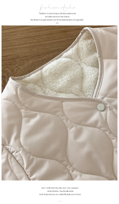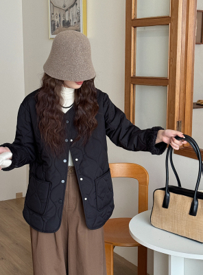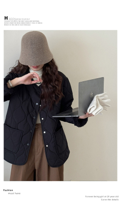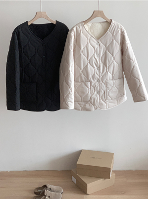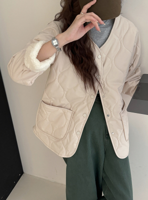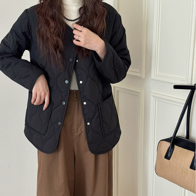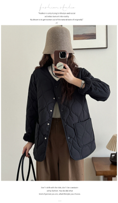 Winter plus velvet Korean style loose small fragrant rhombus warm cotton coat for women collarless splicing light warm cotton coat