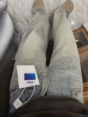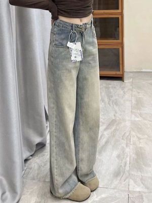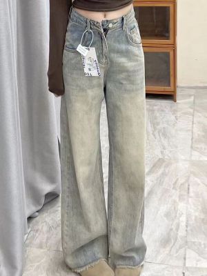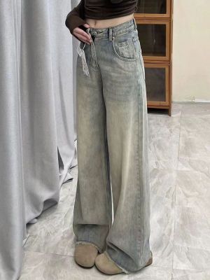Ready stock ~ Distressed retro wide-leg jeans for women, new high-waisted, loose, slimming, raw-edged straight-leg floor mopping pants