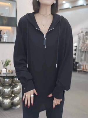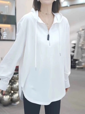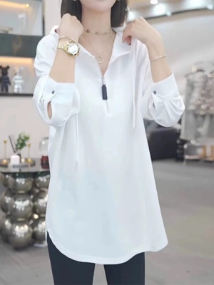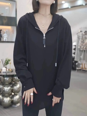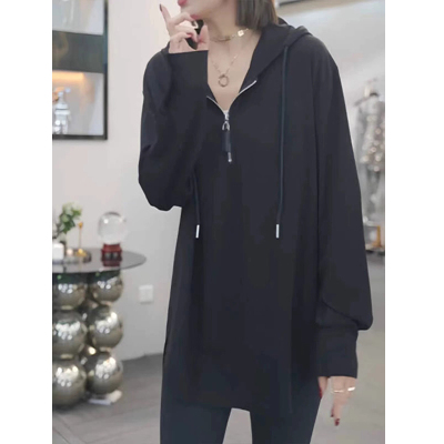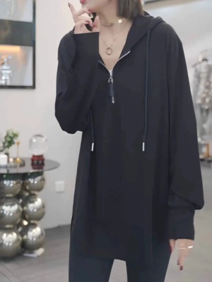 Solid color half-zip hooded sweatshirt for women autumn new large size fat mm popular mid-length loose long-sleeved top