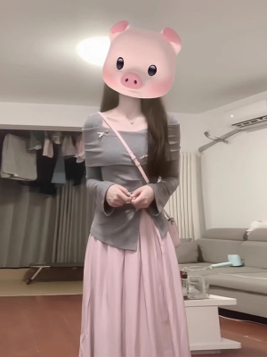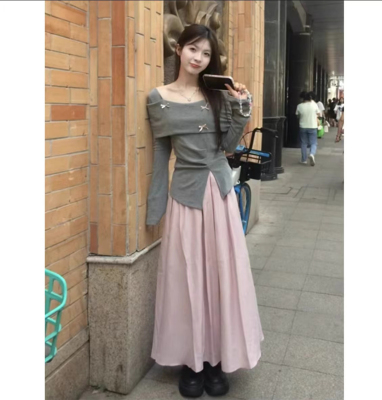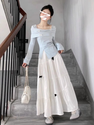 Early Autumn French Blue Long-Sleeve Bow Tie T-Shirt Women's New Petite Frame Elegant Youthful Half Body Skirt Set