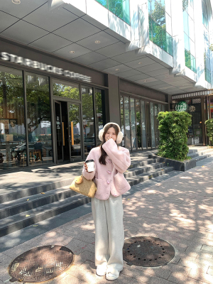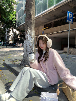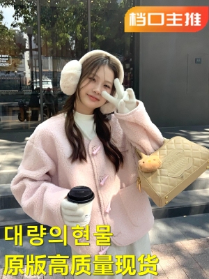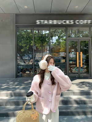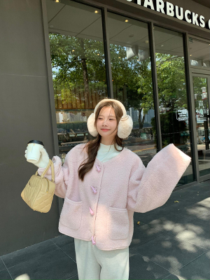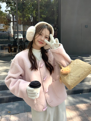 Wu77 Cherry Blossom Pink Horn Button Lamb Velvet Jacket Women's Winter Sweet Loose Short Round Neck Top for Women
