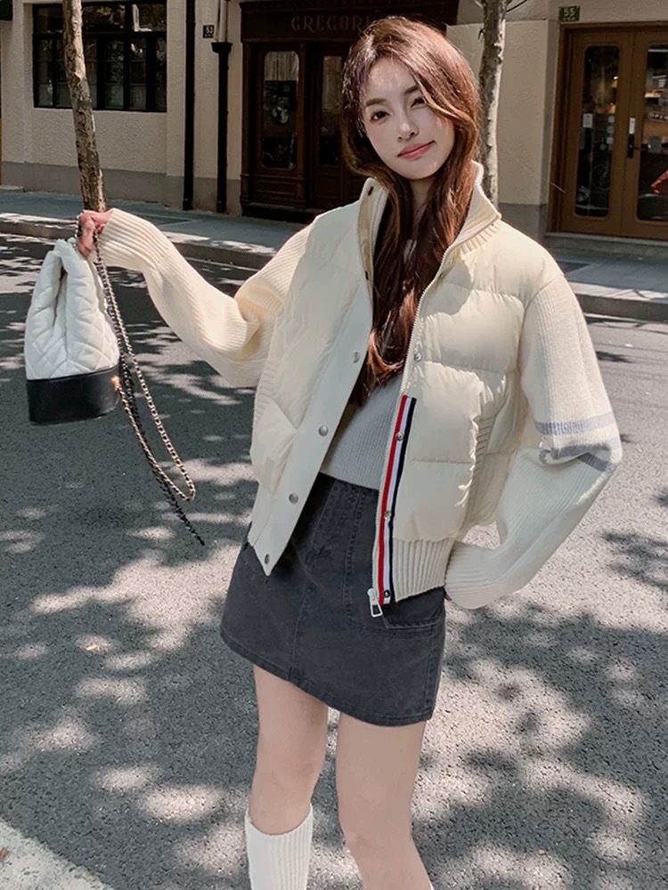 Down jacket women's short 2024 winter new Korean style loose thickened down jacket trendy three-stripe knitted sleeves fashionable