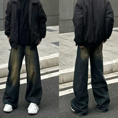 American washed blue belt jeans for men, vintage pants, high street vibe workwear bootcut pants