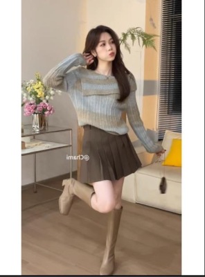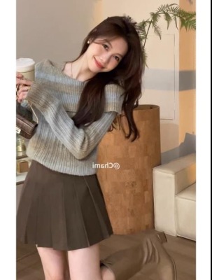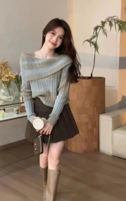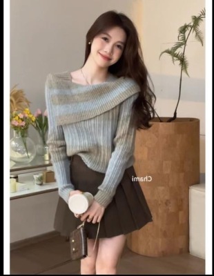 Taiyuan Autumn contrasting color gradient design faux one-line collar pullover sweater + skirt