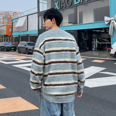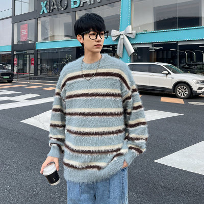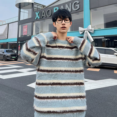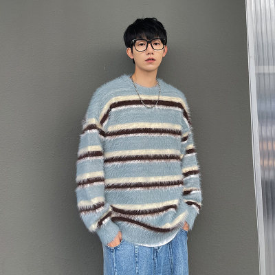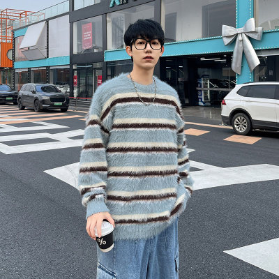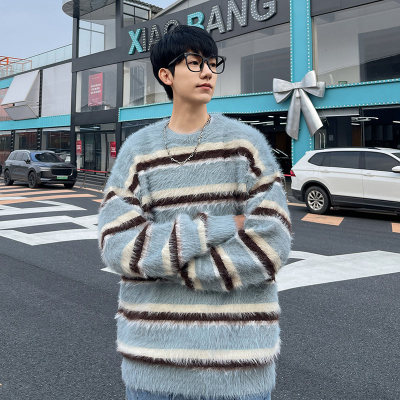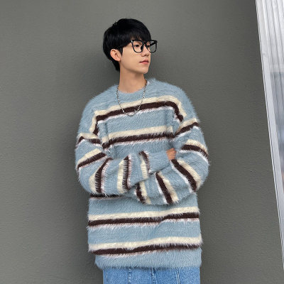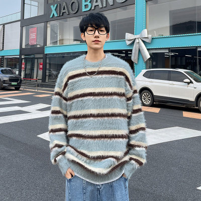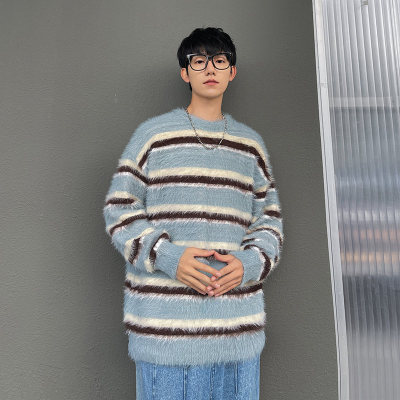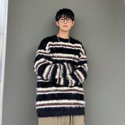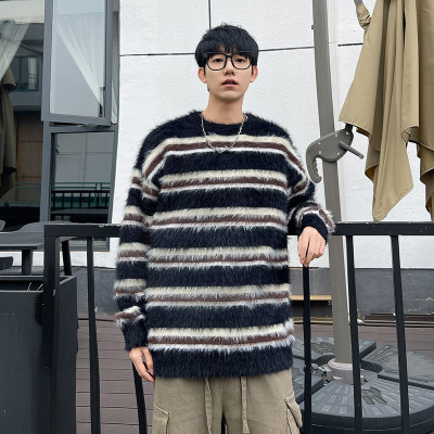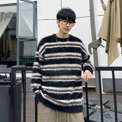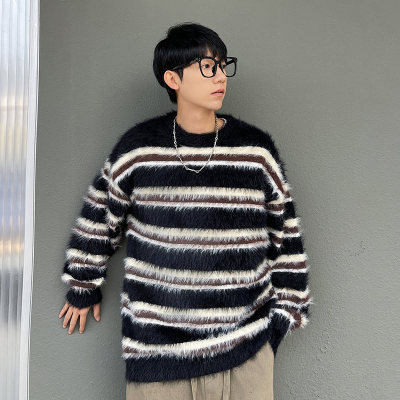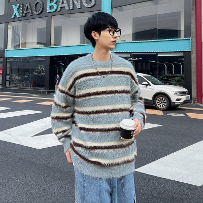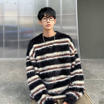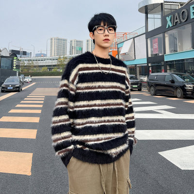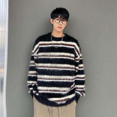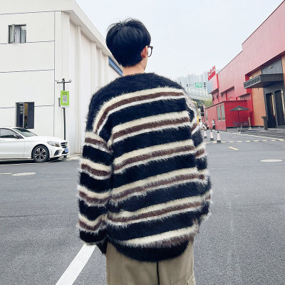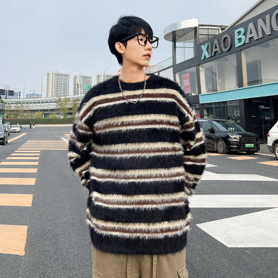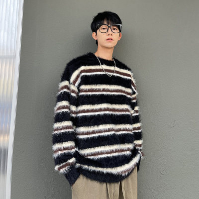 Autumn and winter striped contrasting color round neck sweater trendy brand loose design lazy style sweater
