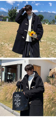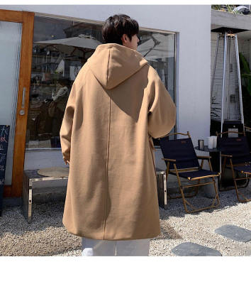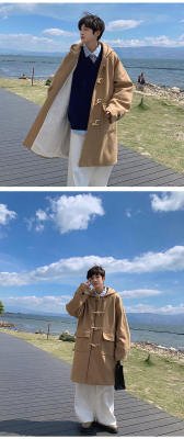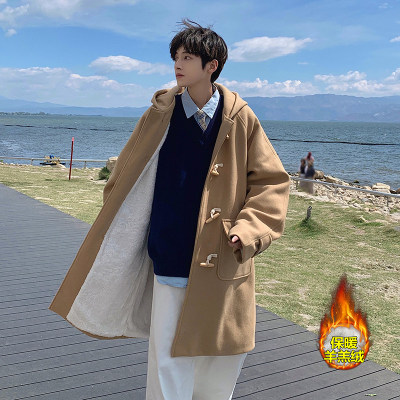 Winter Newport style horn button woolen hooded coat for men, lamb velvet and velvet thickened warm jacket