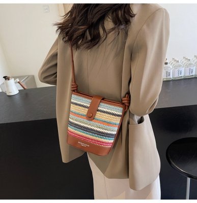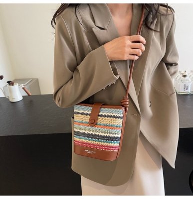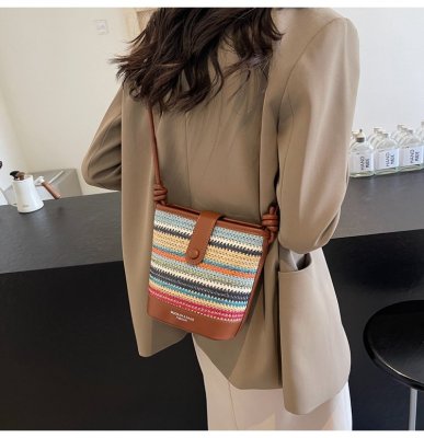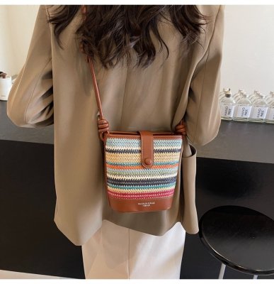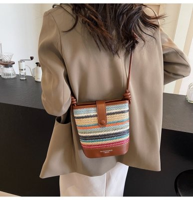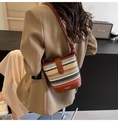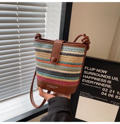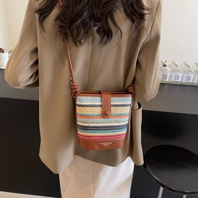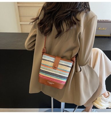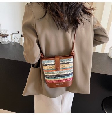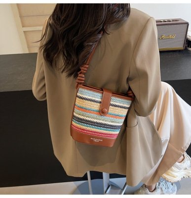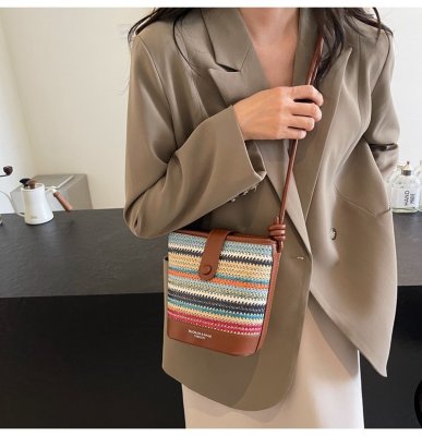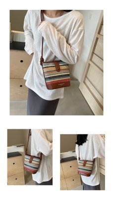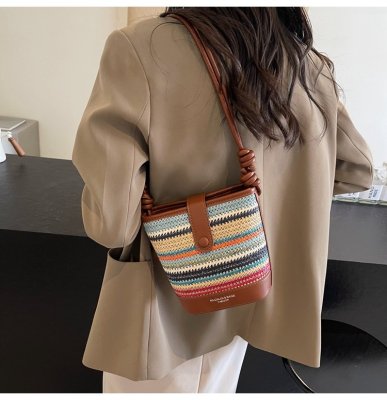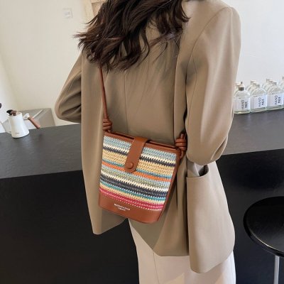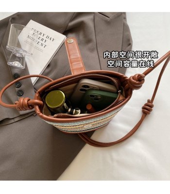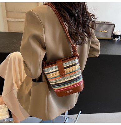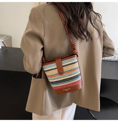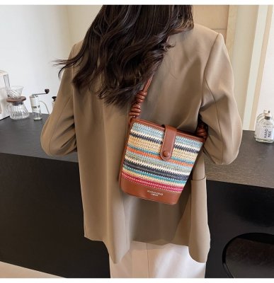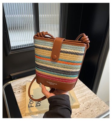 Contrast color woven handbag for women 2024 new Korean style fashion bucket bag niche simple casual texture crossbody bag