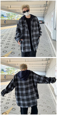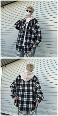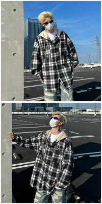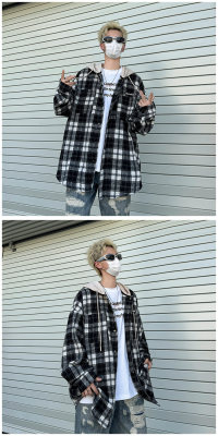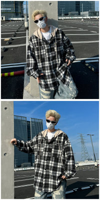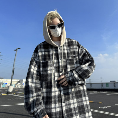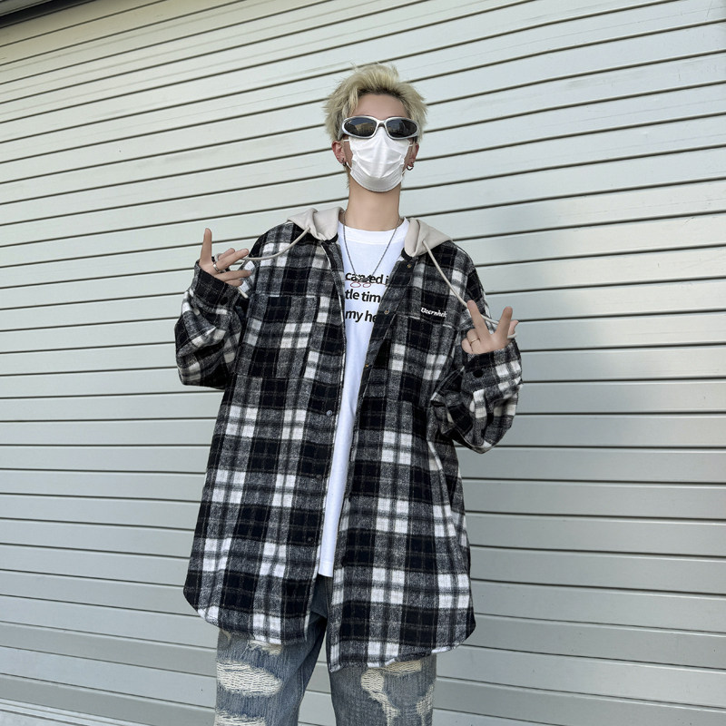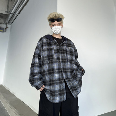 Plaid hooded long-sleeved new American retro trendy brand loose woolen shirt jacket