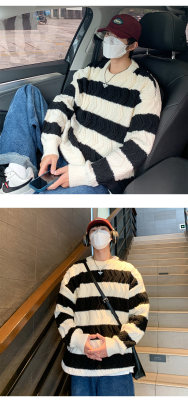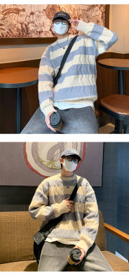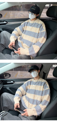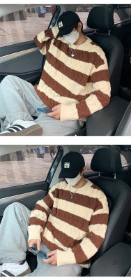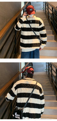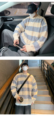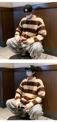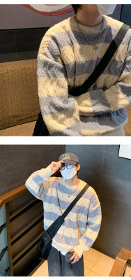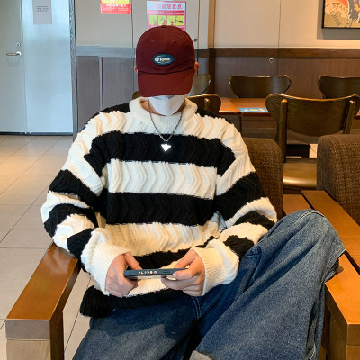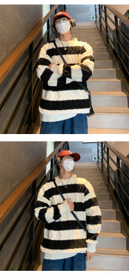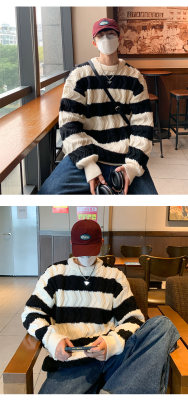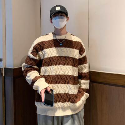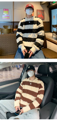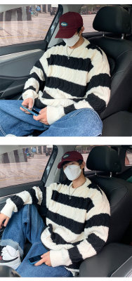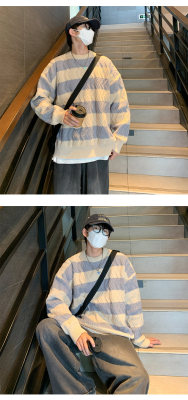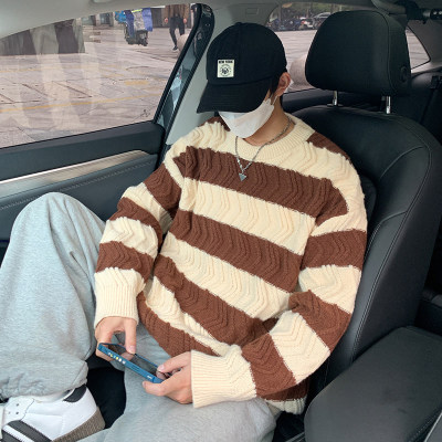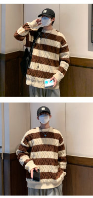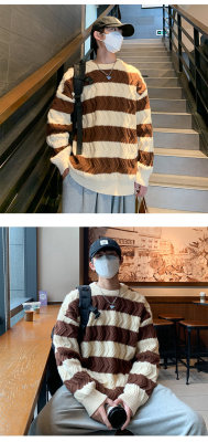 Autumn and winter trendy brand loose couple casual sweater retro twist color block striped round neck sweater