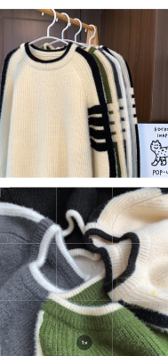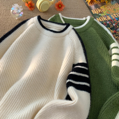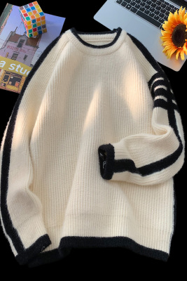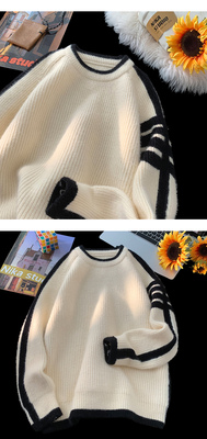 Hong Kong style autumn and winter new contrast color round neck sweater men's loose pullover sweater