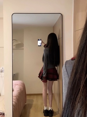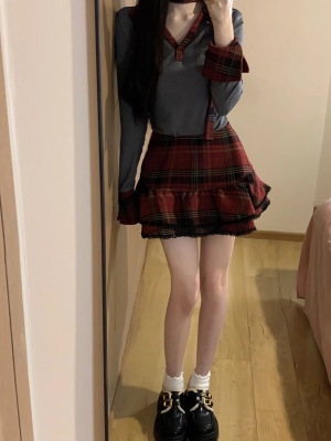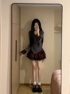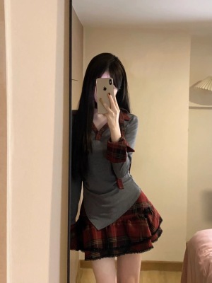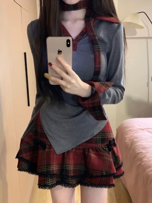 Suit for women 2024 new style college style splicing irregular long-sleeved top high waist slimming puffy short skirt trendy