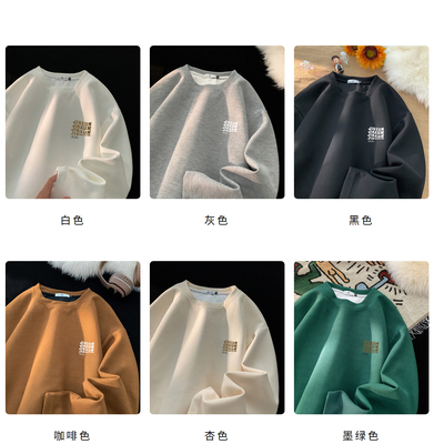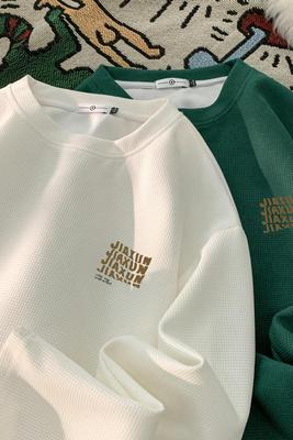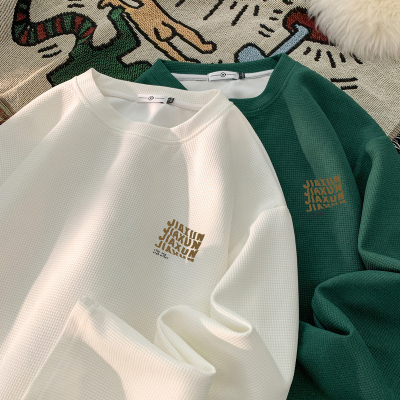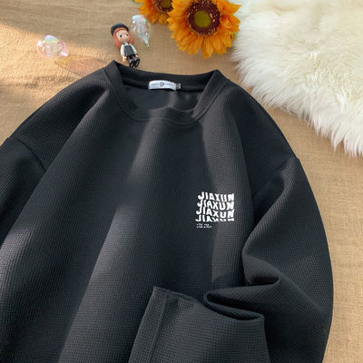 Trendy Casual Waffle Printed Round Neck Long Sleeve T-Shirt Large Size Loose Bottoming