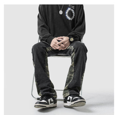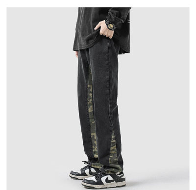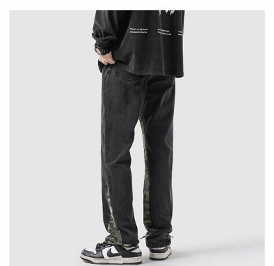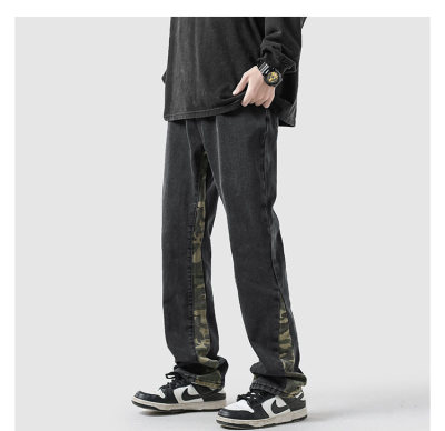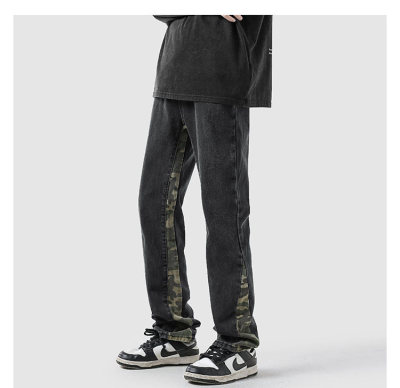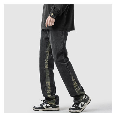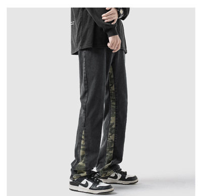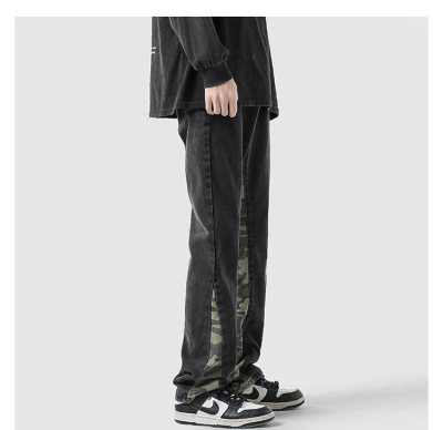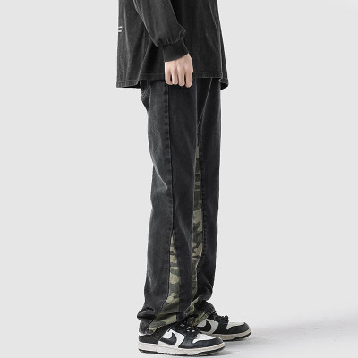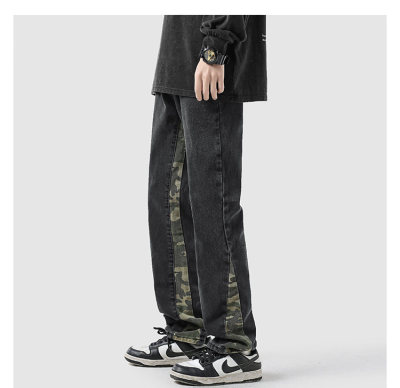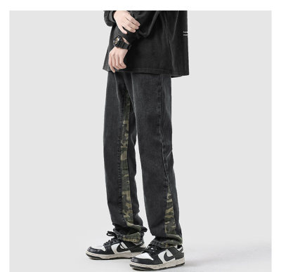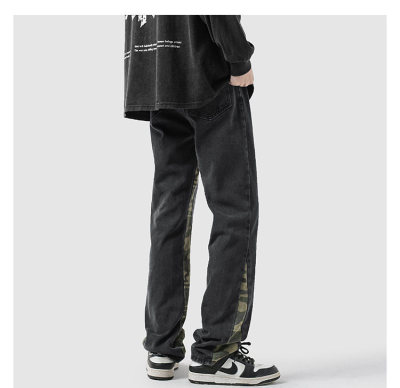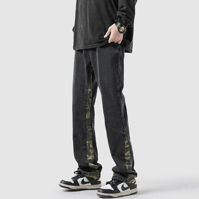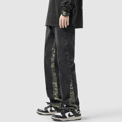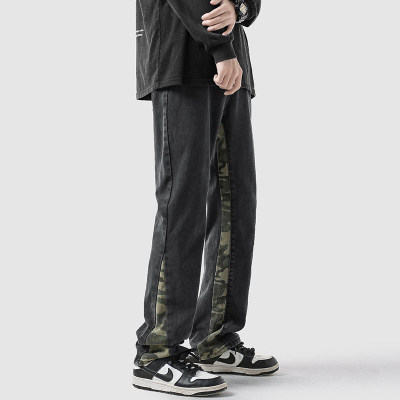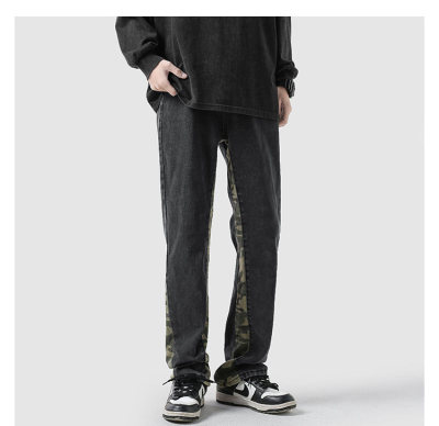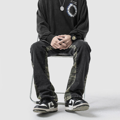 Camouflage splicing jeans men's spring trendy brand loose wide-leg pants trend ins American handsome straight pants