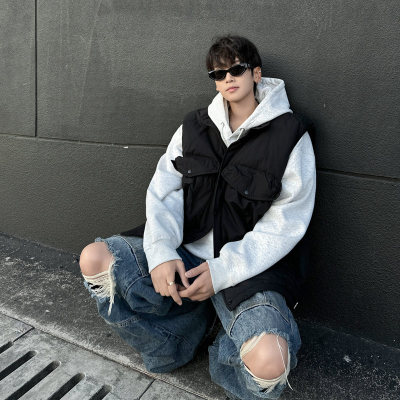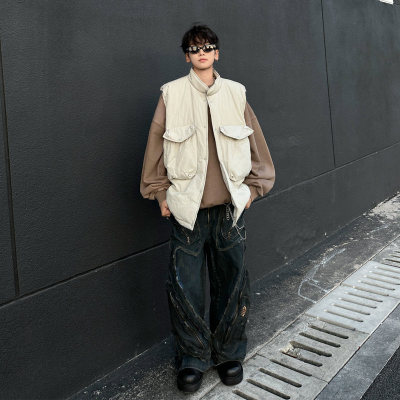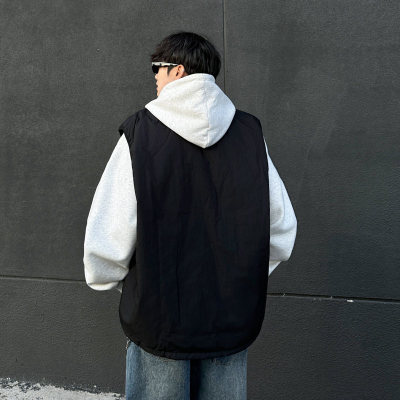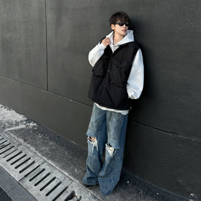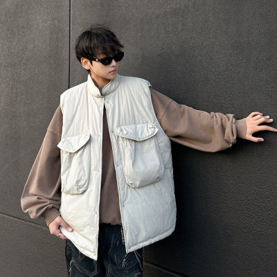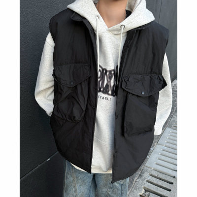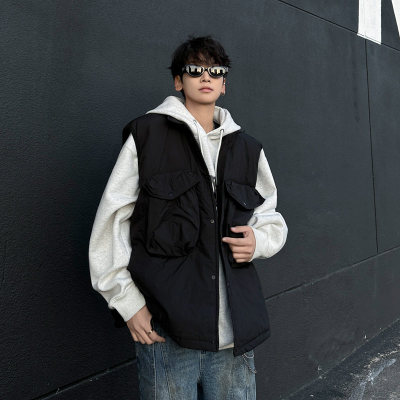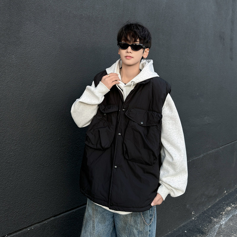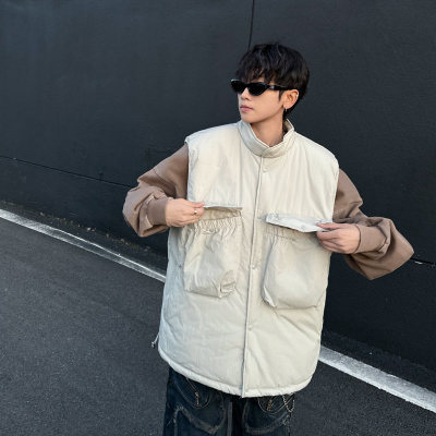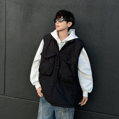 New trendy lazy big pocket solid color cotton vest Japanese style versatile