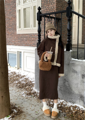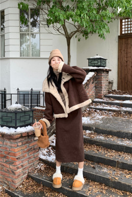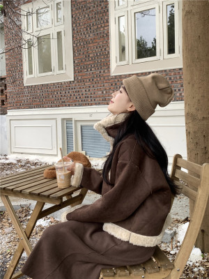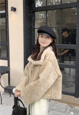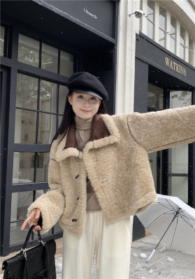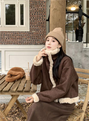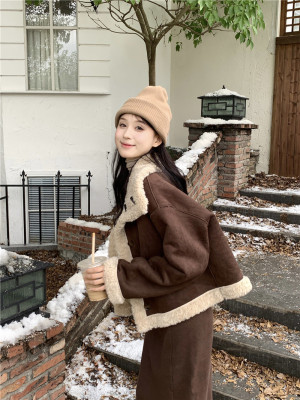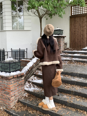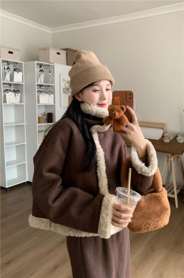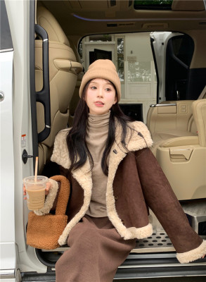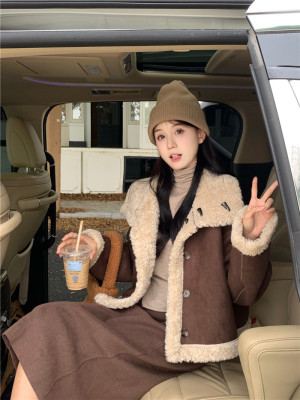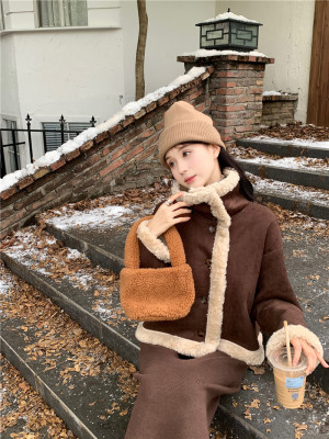 New Maillard brown reversible fur and lamb wool short motorcycle jacket