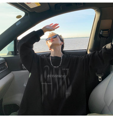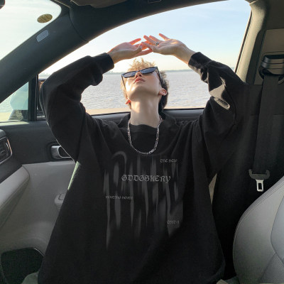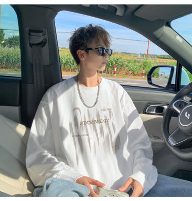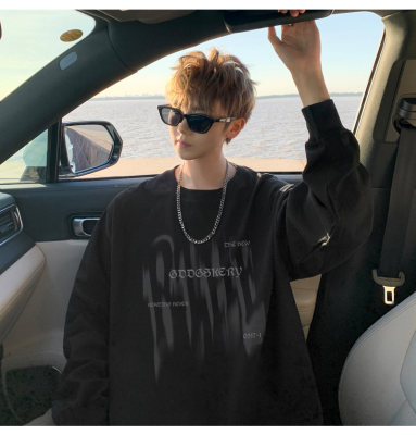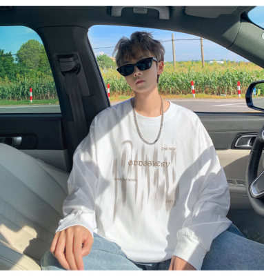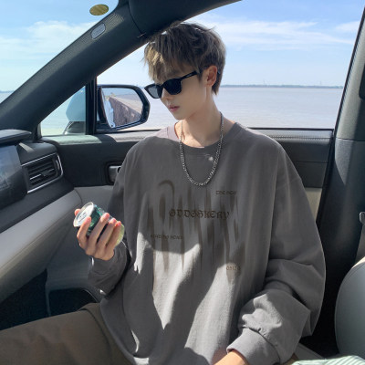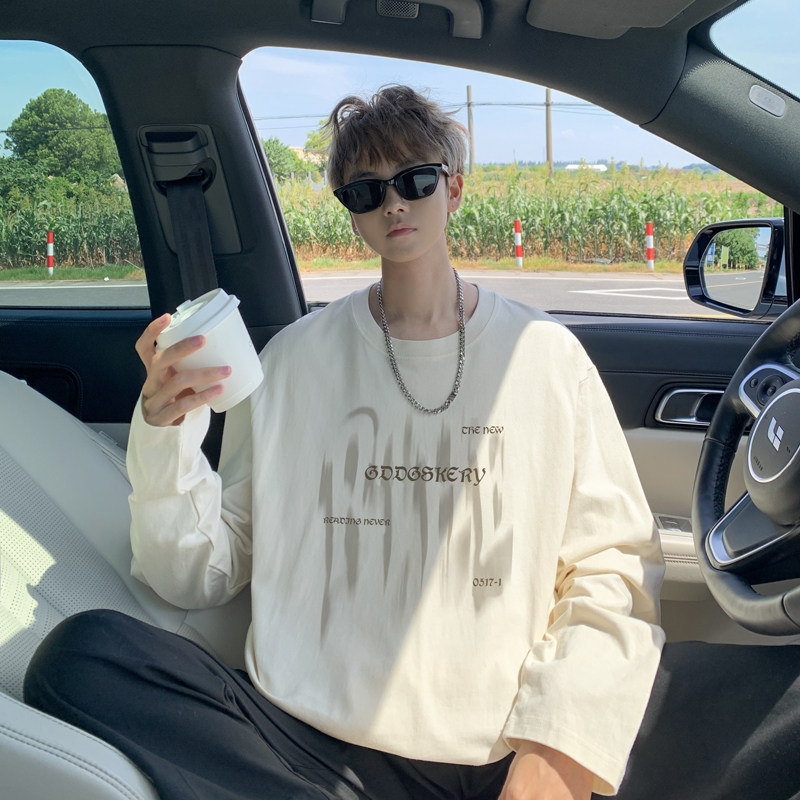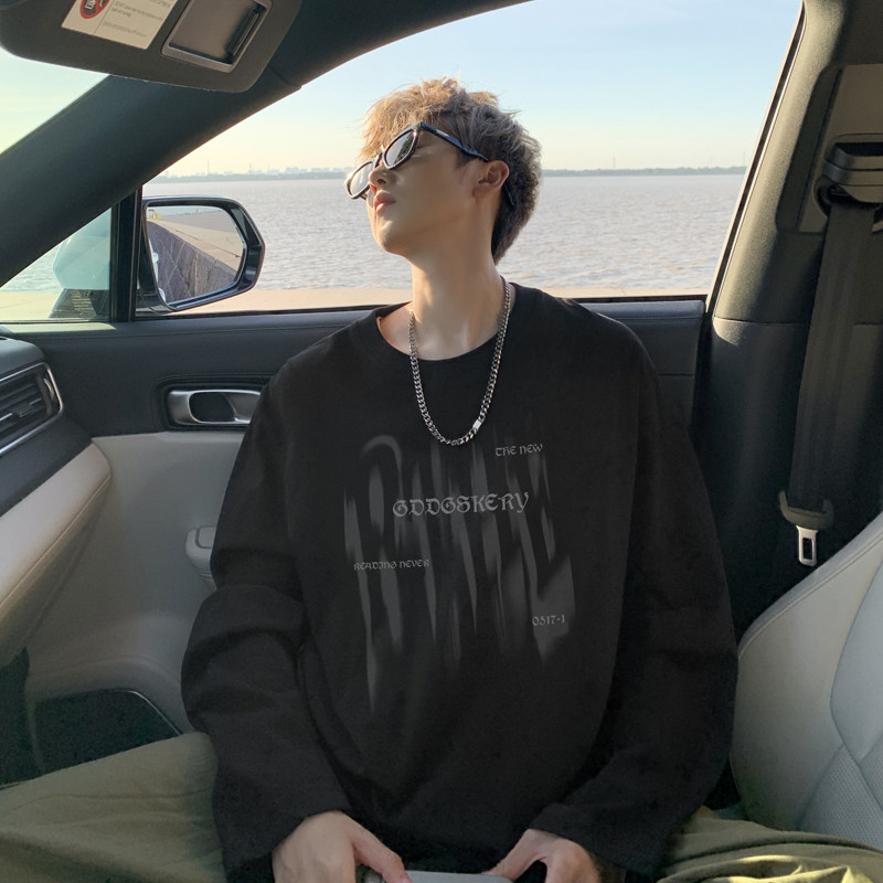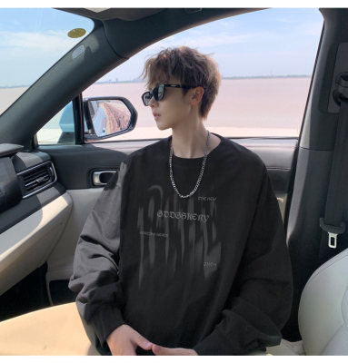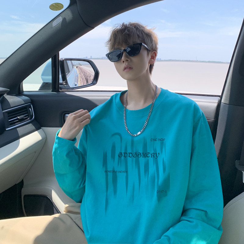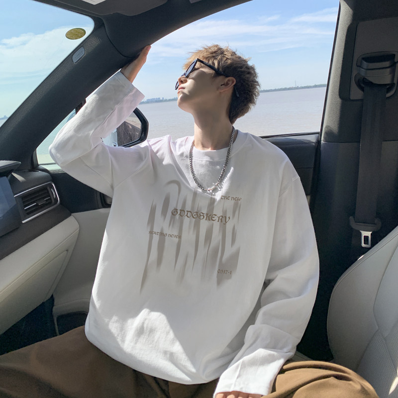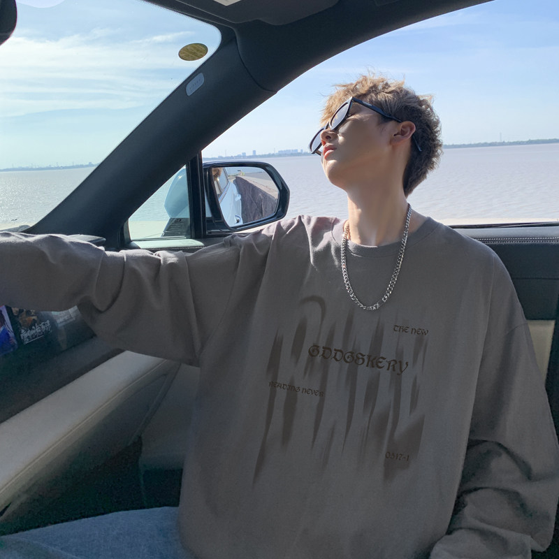 Spliced Spring and Autumn outdoor scene literary couple long-sleeved T-shirt men's trendy youth loose thin sweatshirt