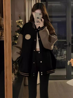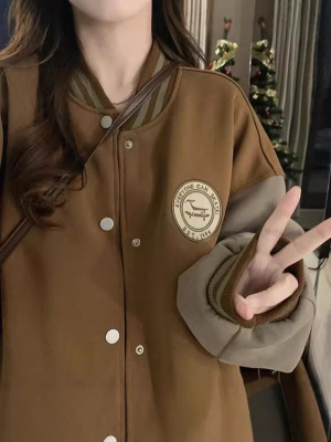 Lazy style baseball uniform jacket for women in autumn and winter velvet thickening retro loose casual cardigan sweatshirt i ns trendy