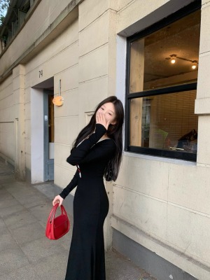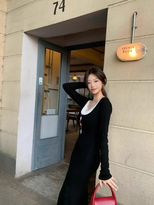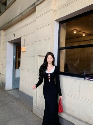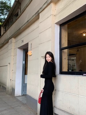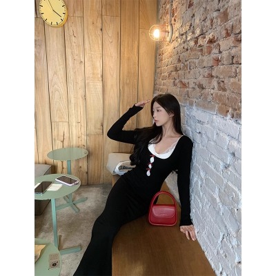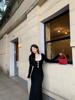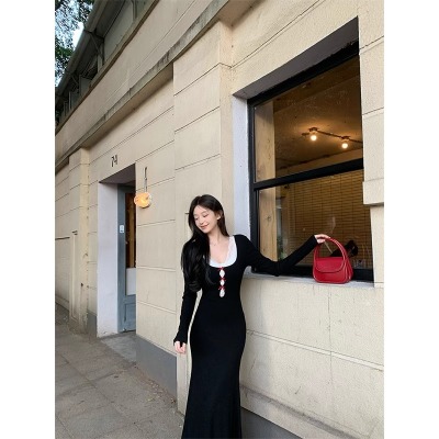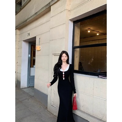 Pure lust style black bow knitted dress for women autumn and winter lace inner waistband hip skirt fishtail long skirt