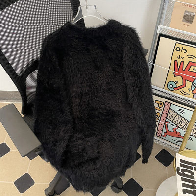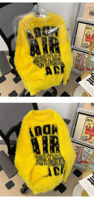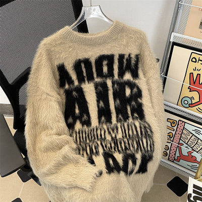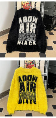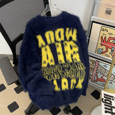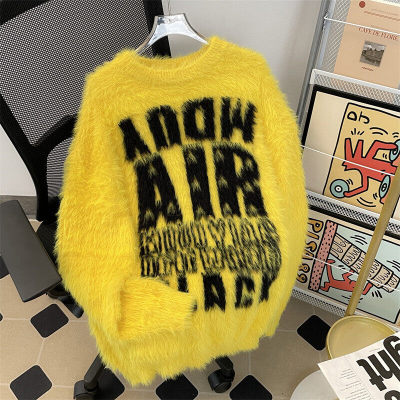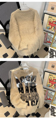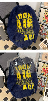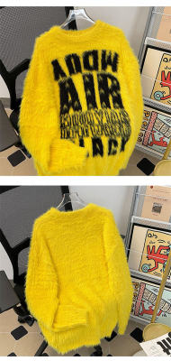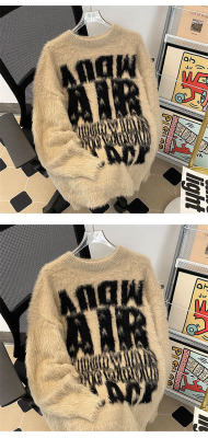 Autumn and winter trendy brand letter jacquard mink velvet warm crew neck sweater