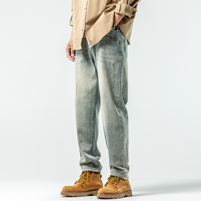 Jeans men's trousers elastic small feet retro washed scratched mid-waist retro blue