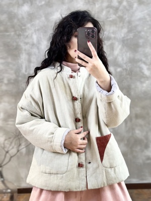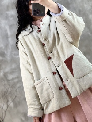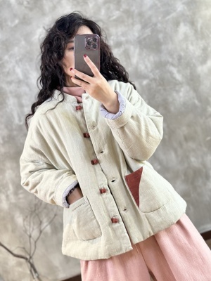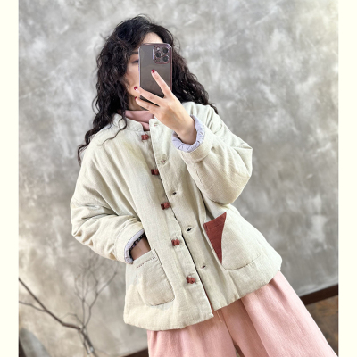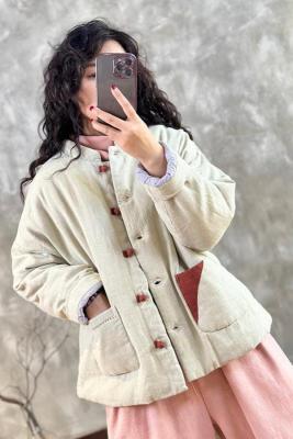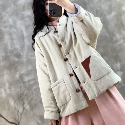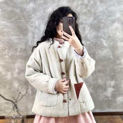 2024 Winter Warmth New Matching Stand Collar Niche Contrast Color Embroidery Thread Disc Button Slimming Cotton Clothes